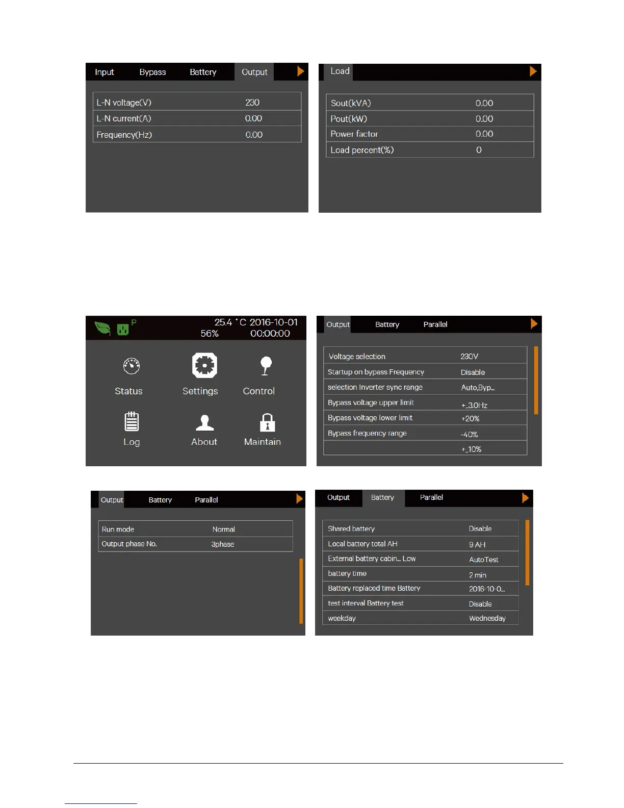 The Settings page contains the Output, Battery, Parallel, Monitor, System, and Outlet. For details about the