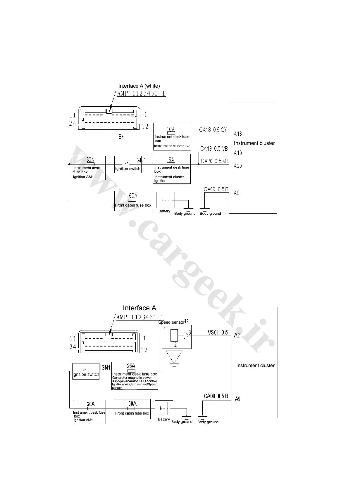 between harness terminals A21 and A9 of instrument cluster when wheels turn slowly, normally,