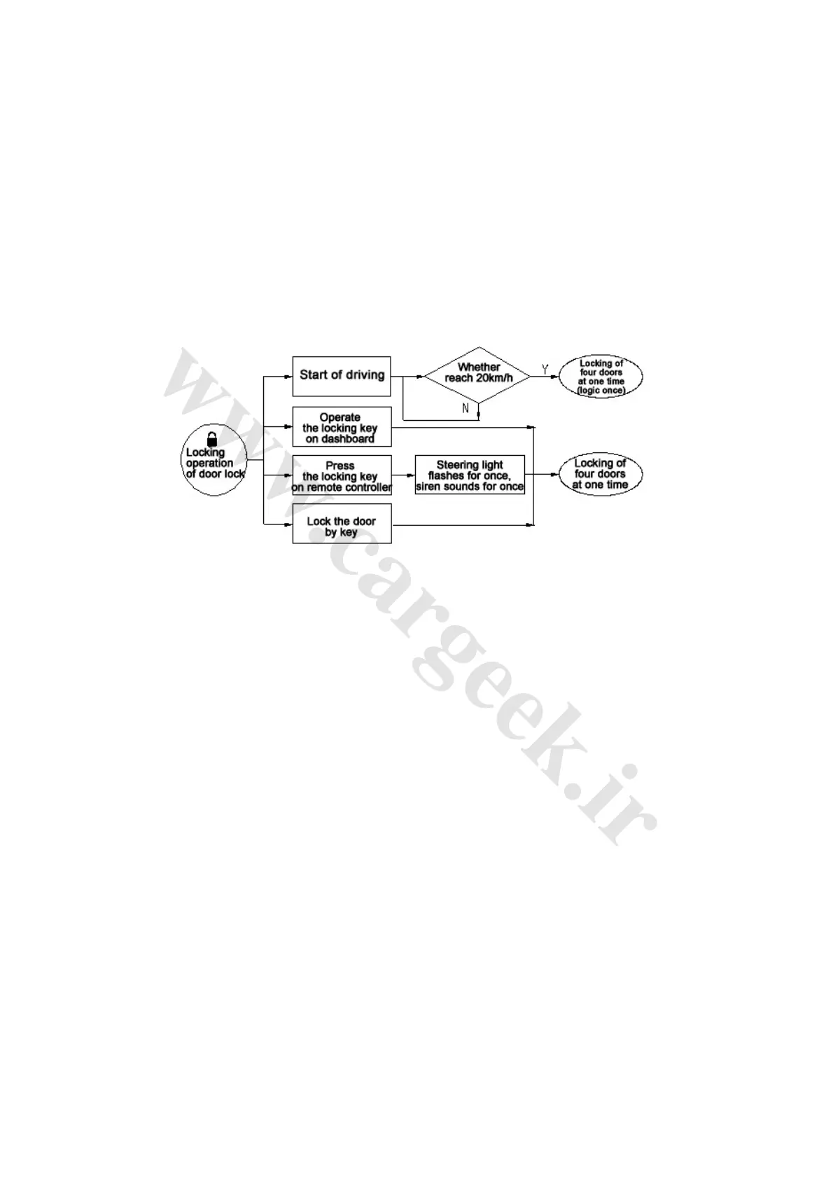 After car stops, ignition key returns from “ON” to “ACC”, locking of four doors will act