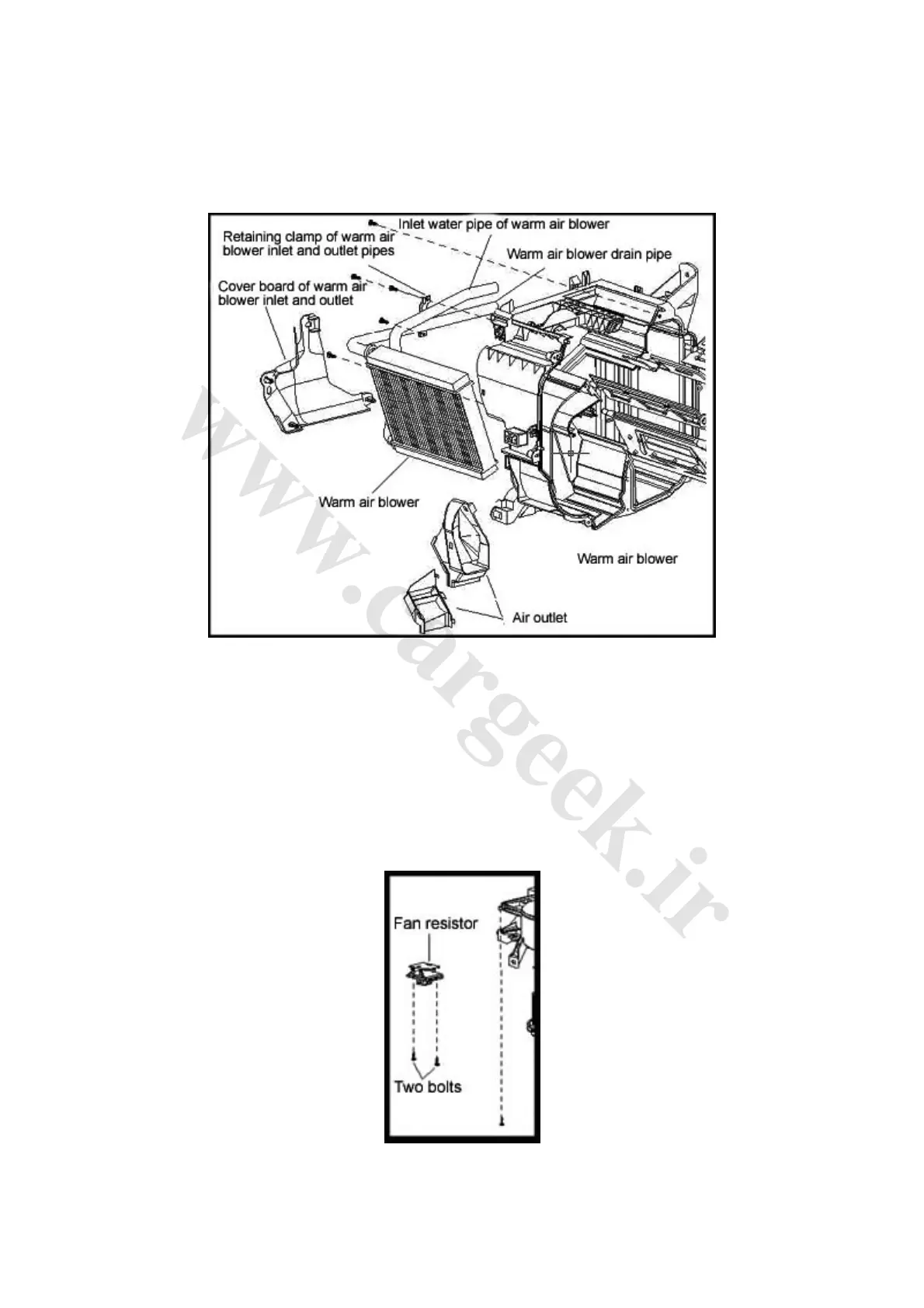 1) Disassemble the inlet and outlet cover board of heater and lower air outlet of the CAB, as