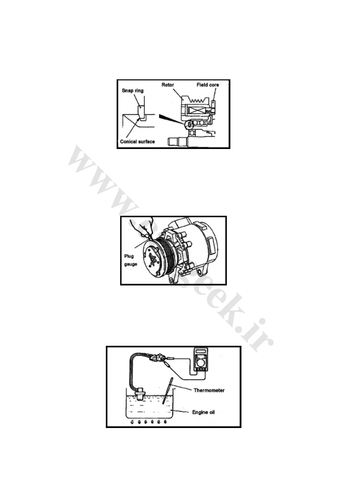 not within standard value, adjust with washer. Standard value: 0.3-0.5mm. Check compressor