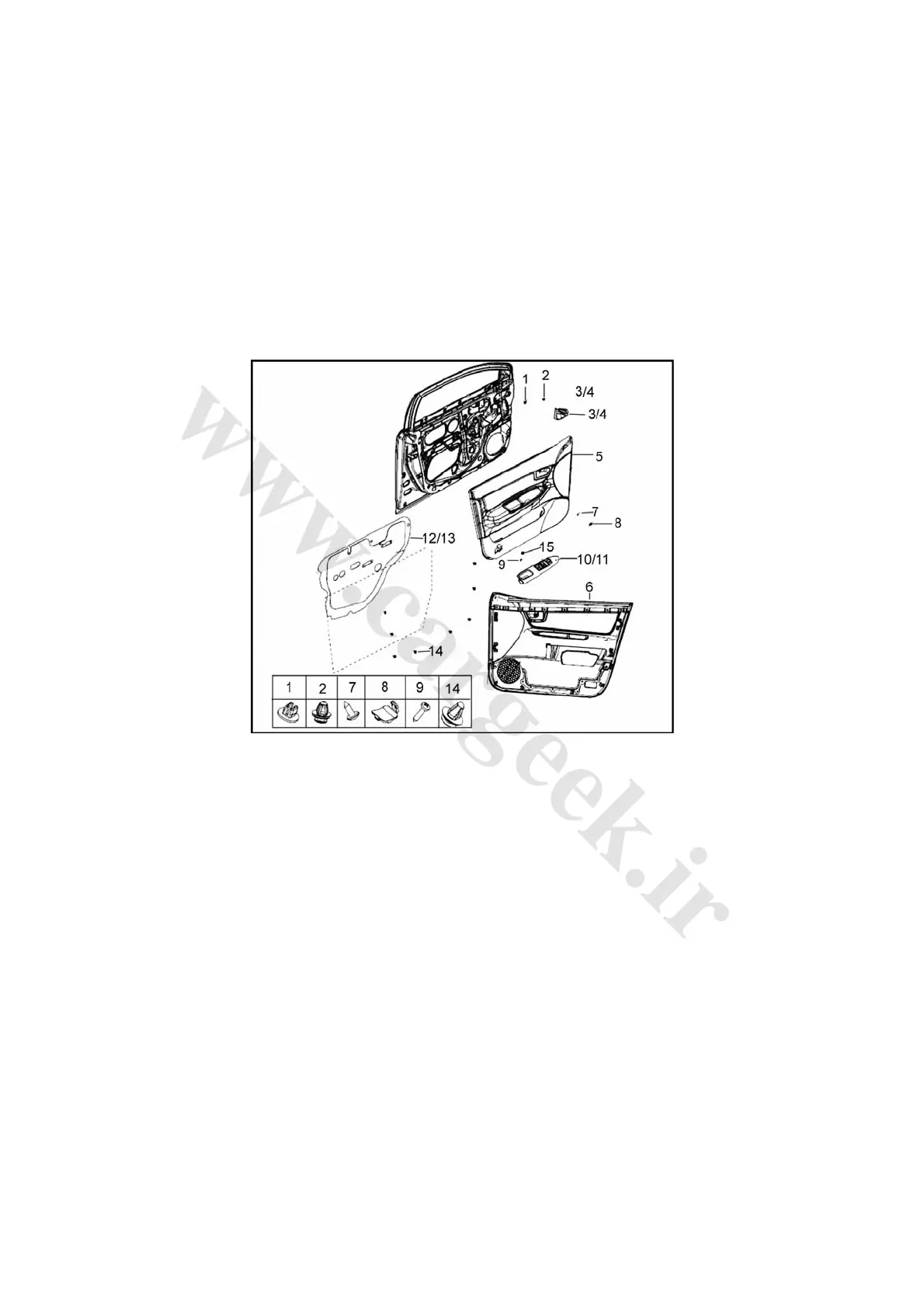13. Right front side door sealing felt pad assembly 14. Front door guard panel fixing buckle