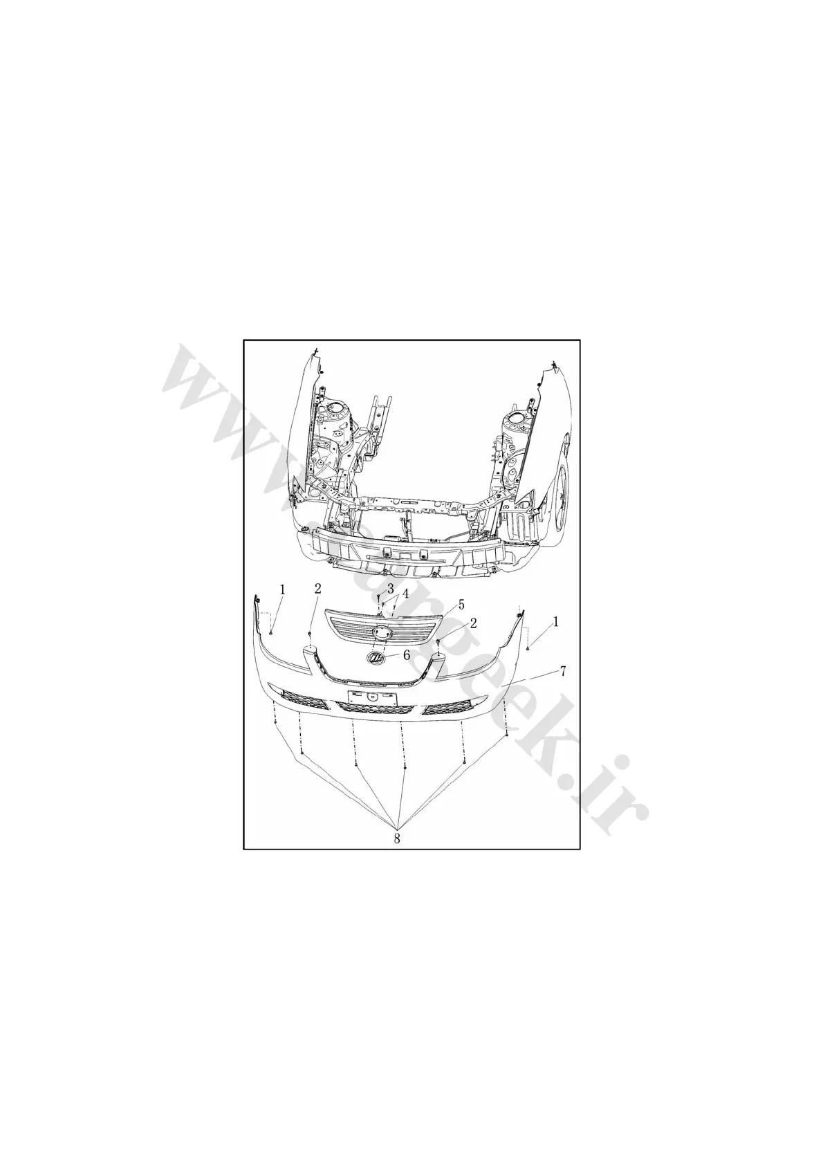 4. Cross slot cup head self-tapping screw 5. Front grille 6. Mark 7. Front bumper