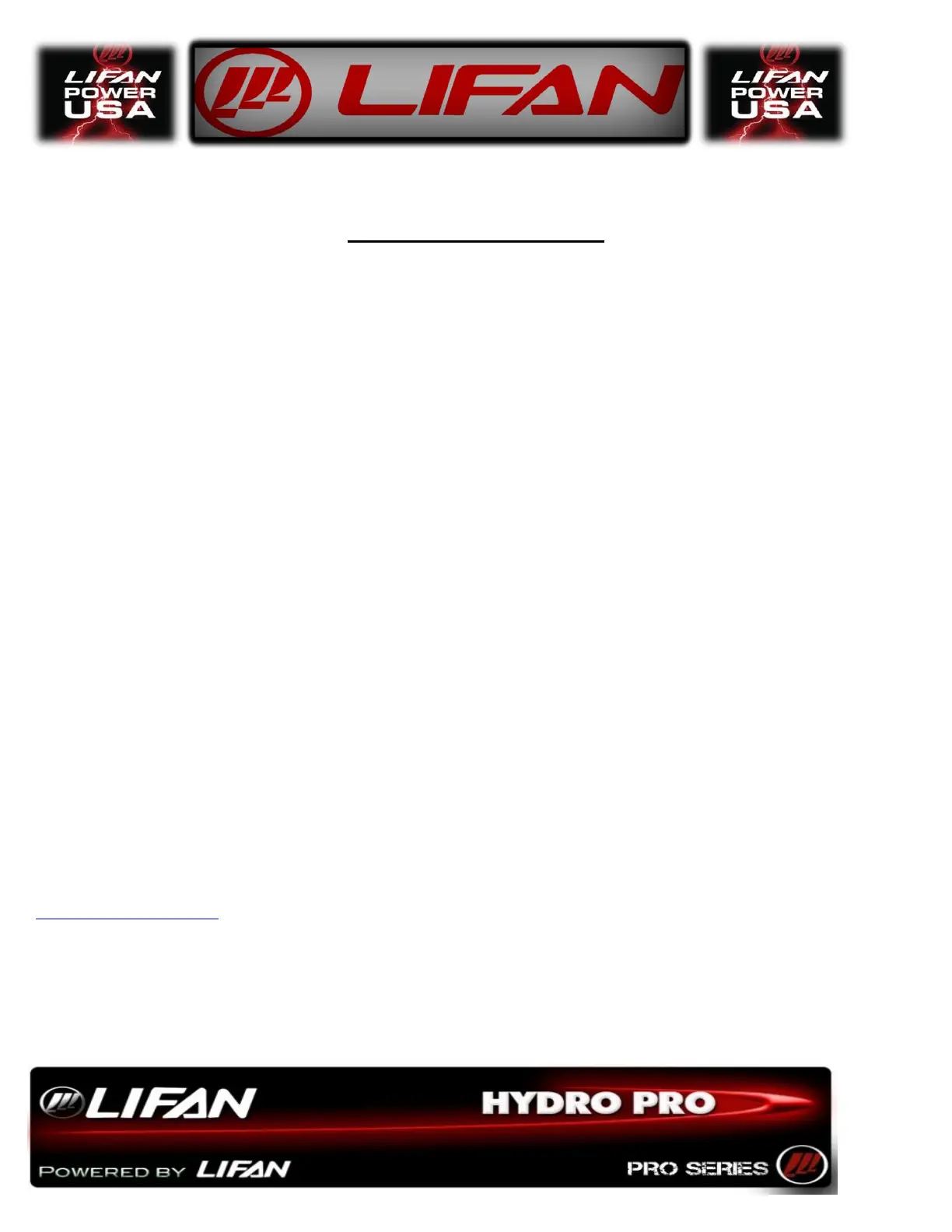 address Lifan Power USA, 2205 Industrial Park Road, Van Buren, AR 72956 or by contacting us through
