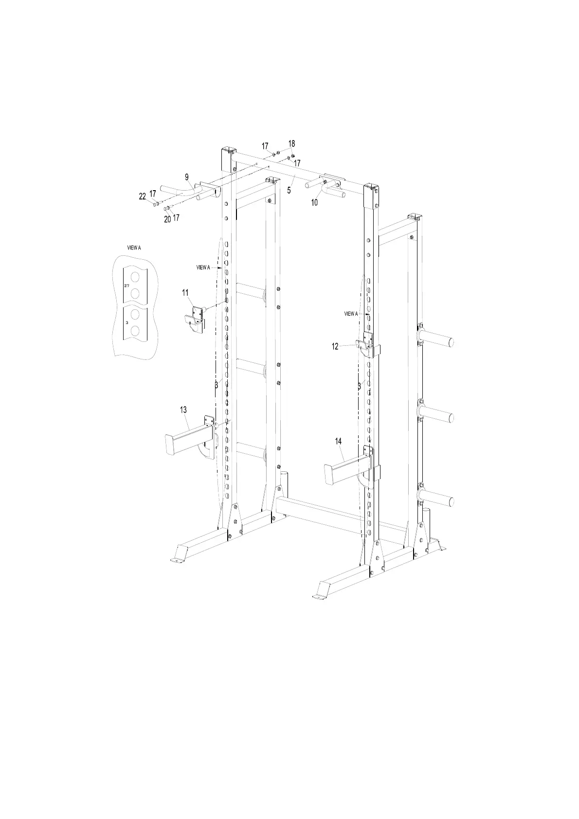 b) Attach Safety Spotters (13 and 14) and Bar Hooks (11 and 12) onto the assembled frame