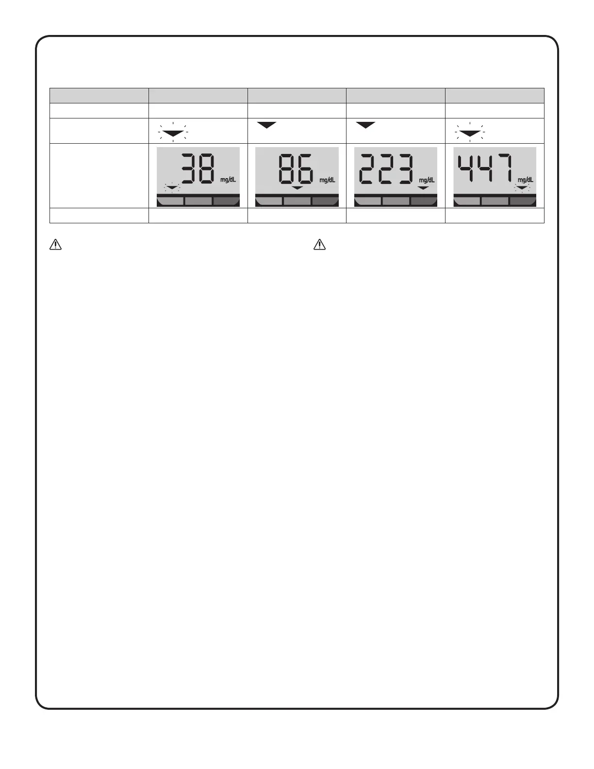 Blood glucose range: 20mg/dL to 69mg/dL 70mg/dL to 179mg/dL 180mg/dL to 239mg/dL 240mg/dL to 600mg/dL