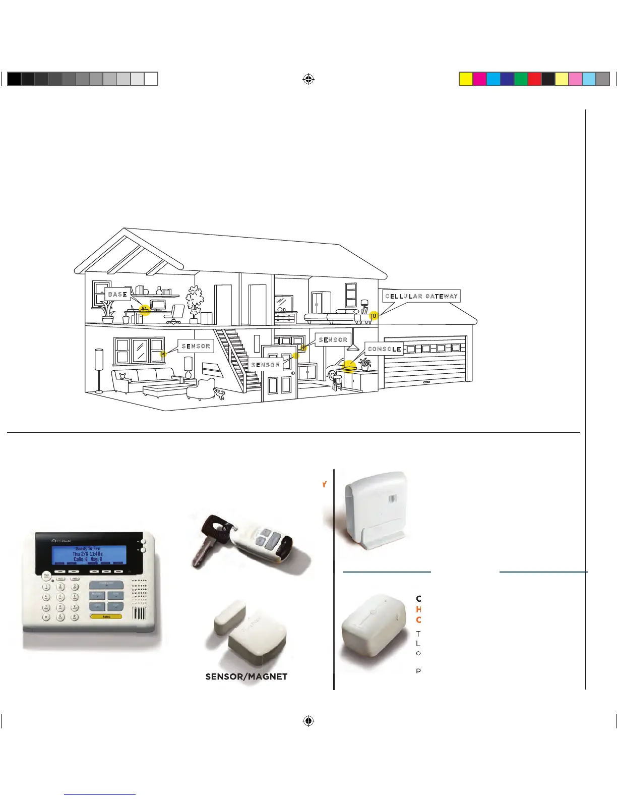 Sensors are within approximately 30 feet of one or more of the main components (base/cellular gateway, console).