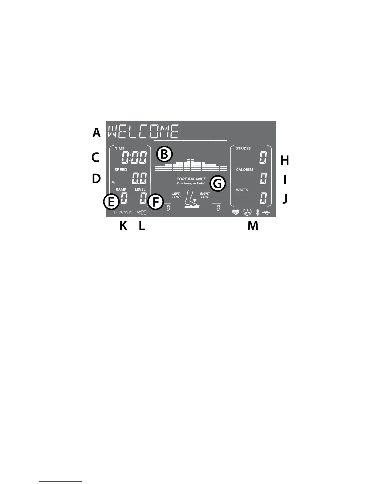 F. Level - Level of resistance on the pedals, ranging from 1 (180 watts at