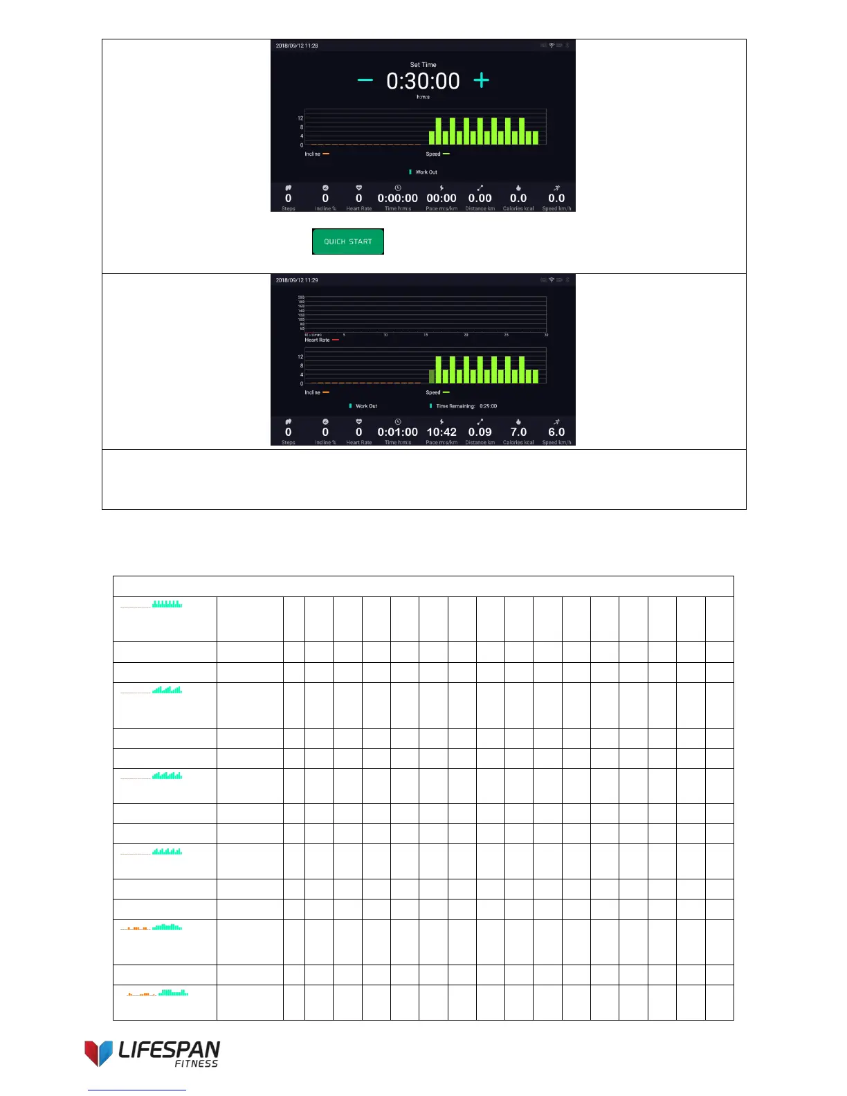 for each segment of the program are shown in the table below. The incline and speed windows show the