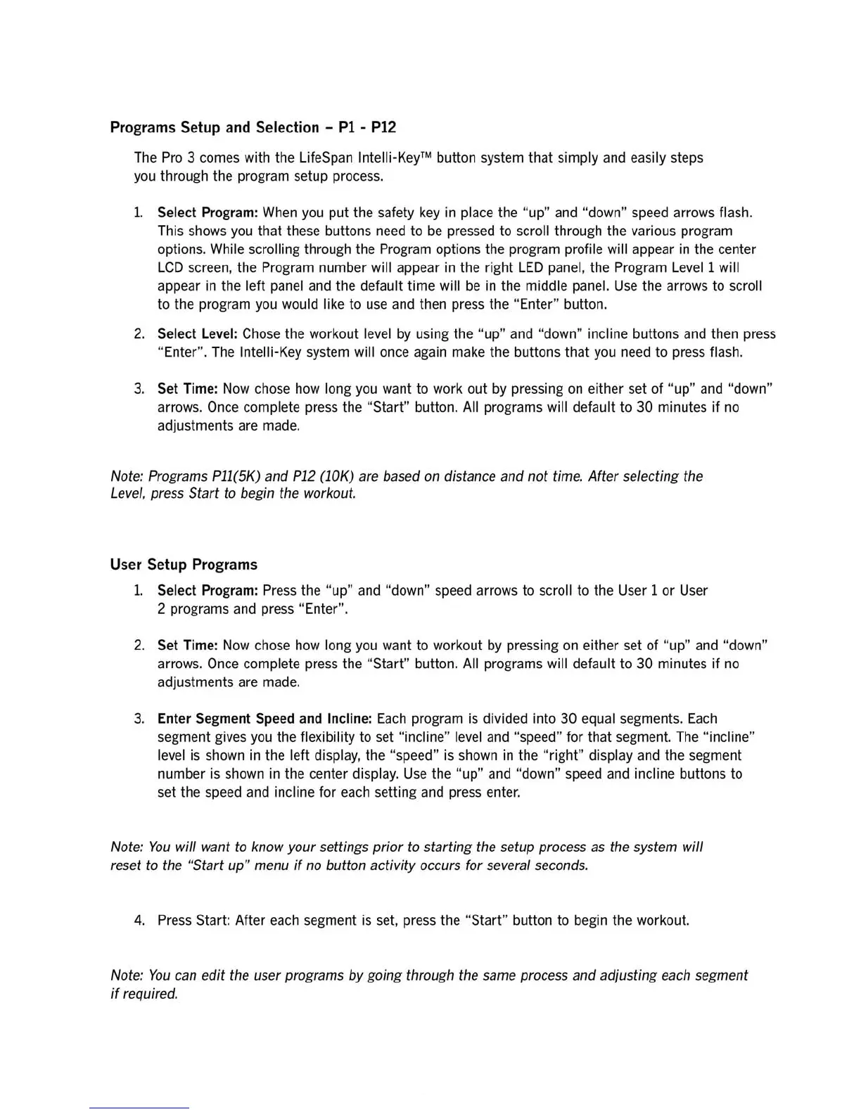 LifeSpan PRO 3 - Treadmill Program Setup and Selection; User Setup Program Guide