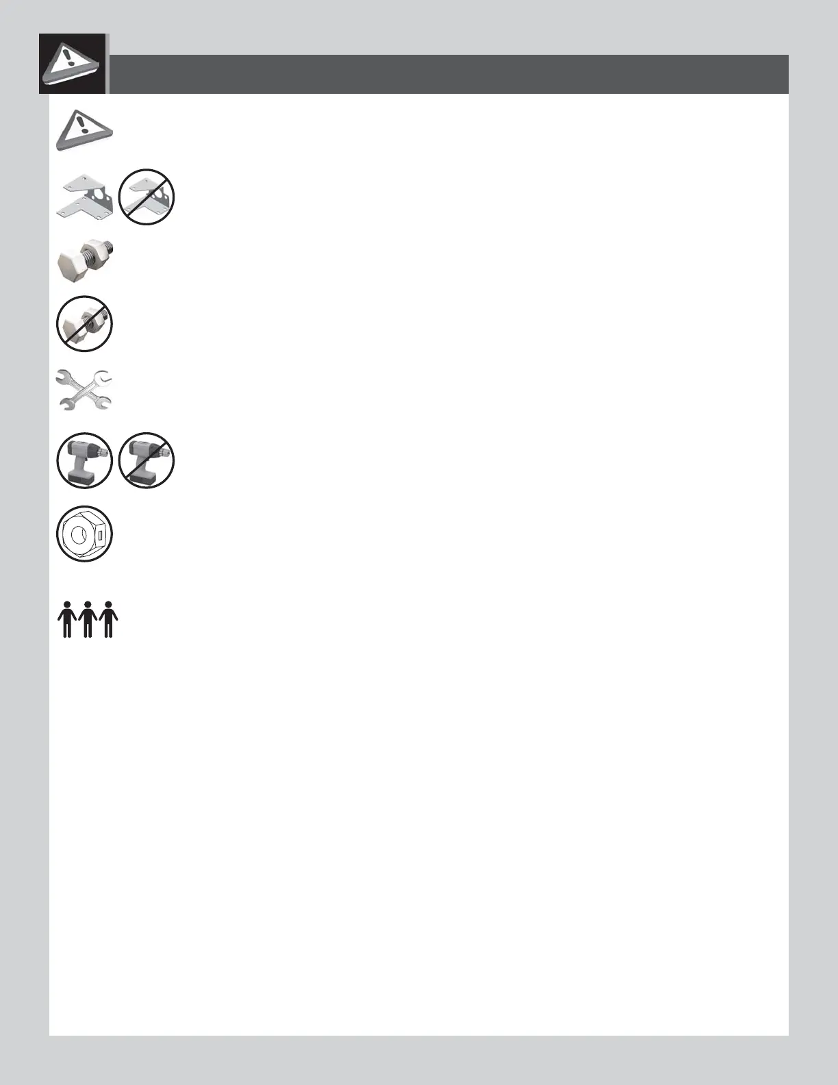 • Indicates to use/not use an electric drill for a specifi c step.