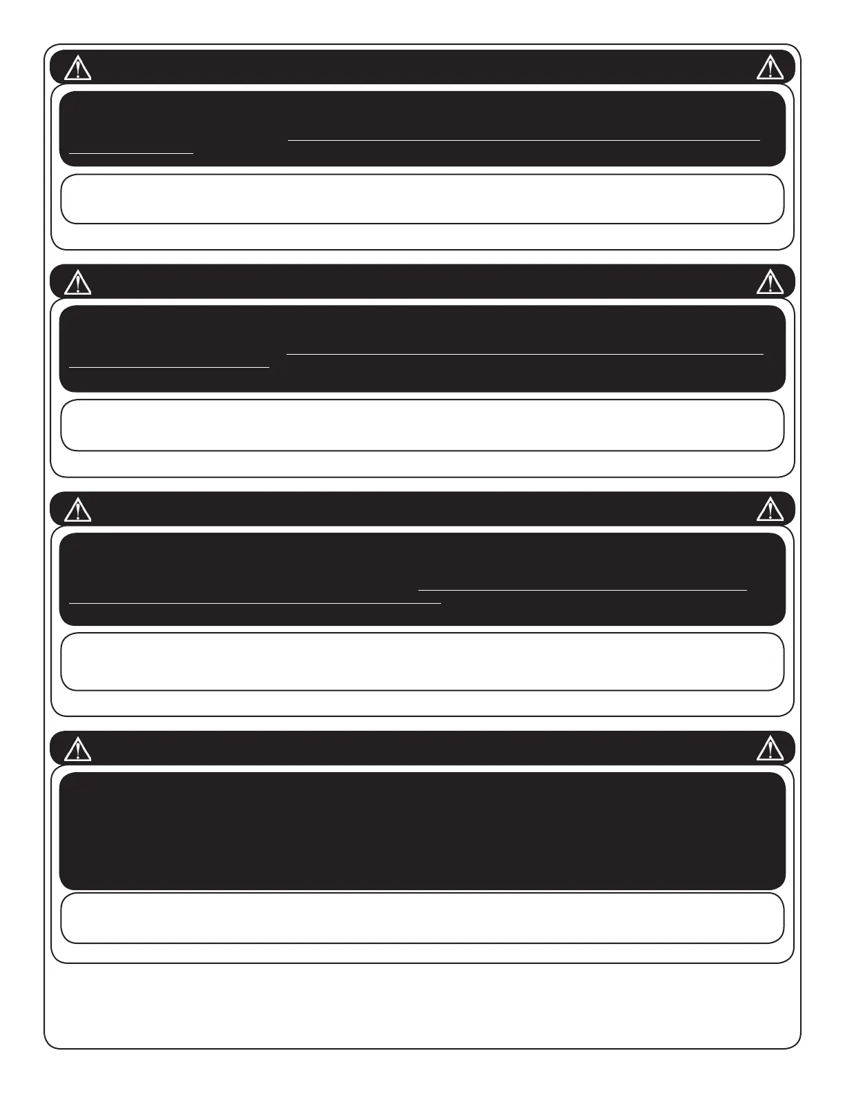 FAILURE TO FOLLOW THESE WARNINGS MAY RESULT IN SERIOUS INJURY OR PROPERTY DAMAGE AND WILL VOID WARRANTY.