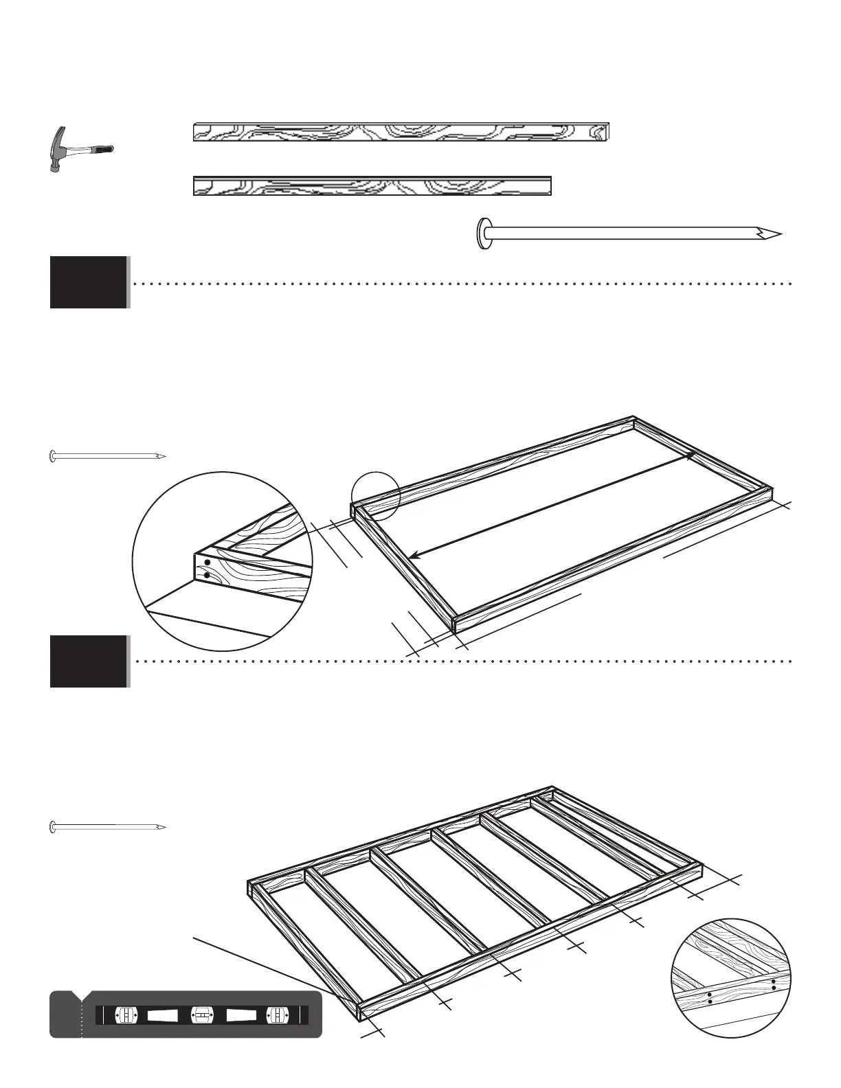 • Ensure all lumber is treated and approved for outdoor use. Build frame to 93 1/2” x 58” (2,38 m x 1,47 m)