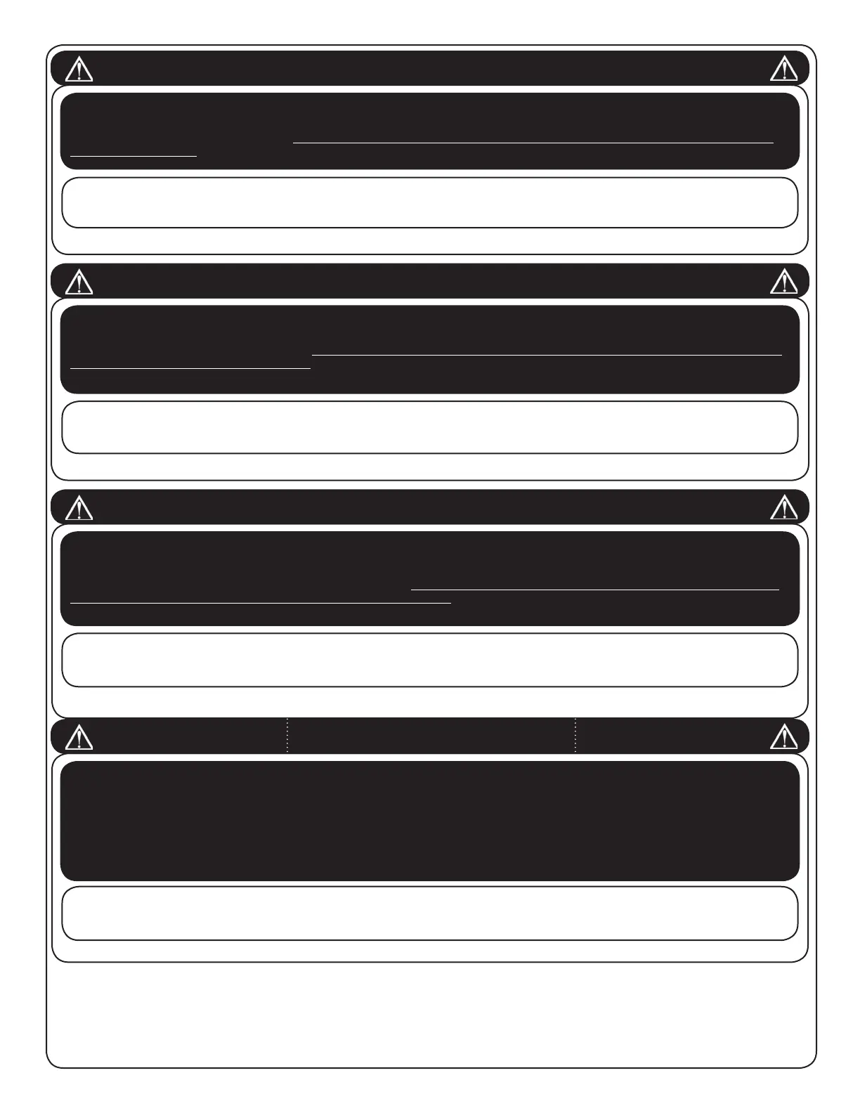 FAILURE TO FOLLOW THESE WARNINGS MAY RESULT IN SERIOUS INJURY OR PROPERTY DAMAGE AND WILL VOID WARRANTY.