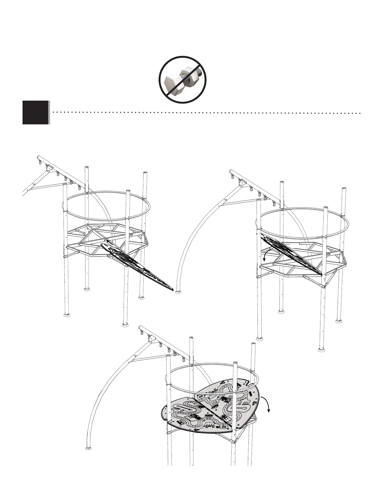 • Faire glisser la plate-forme (DYB) à un angle sur la charpente, ensuite abaisser-le en place. Répéter cette étape pour