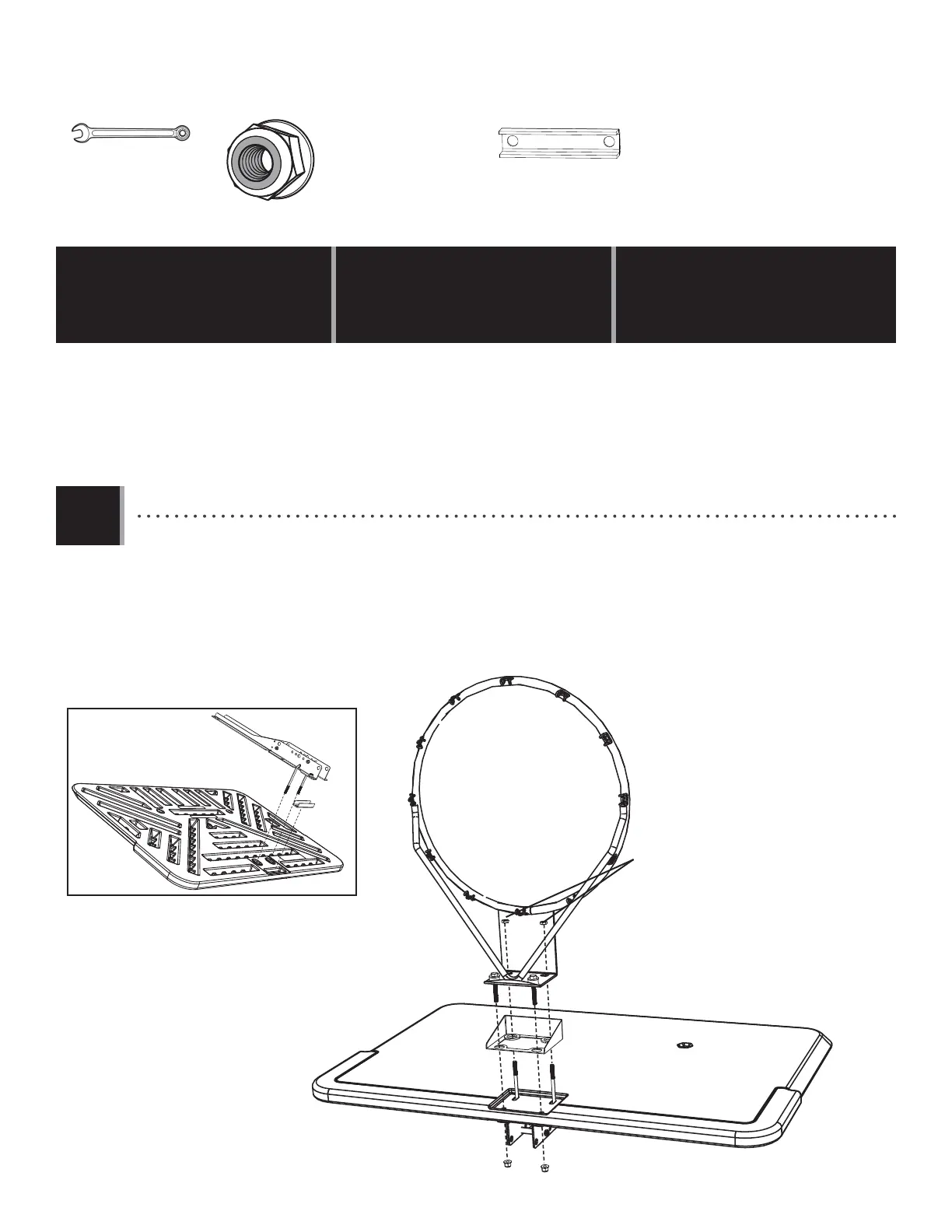 location shown. Attach the Rim Assembly and the Plastic Guard (ALD) to the Backboard (AJI). Tighten the Jam Nuts onto the