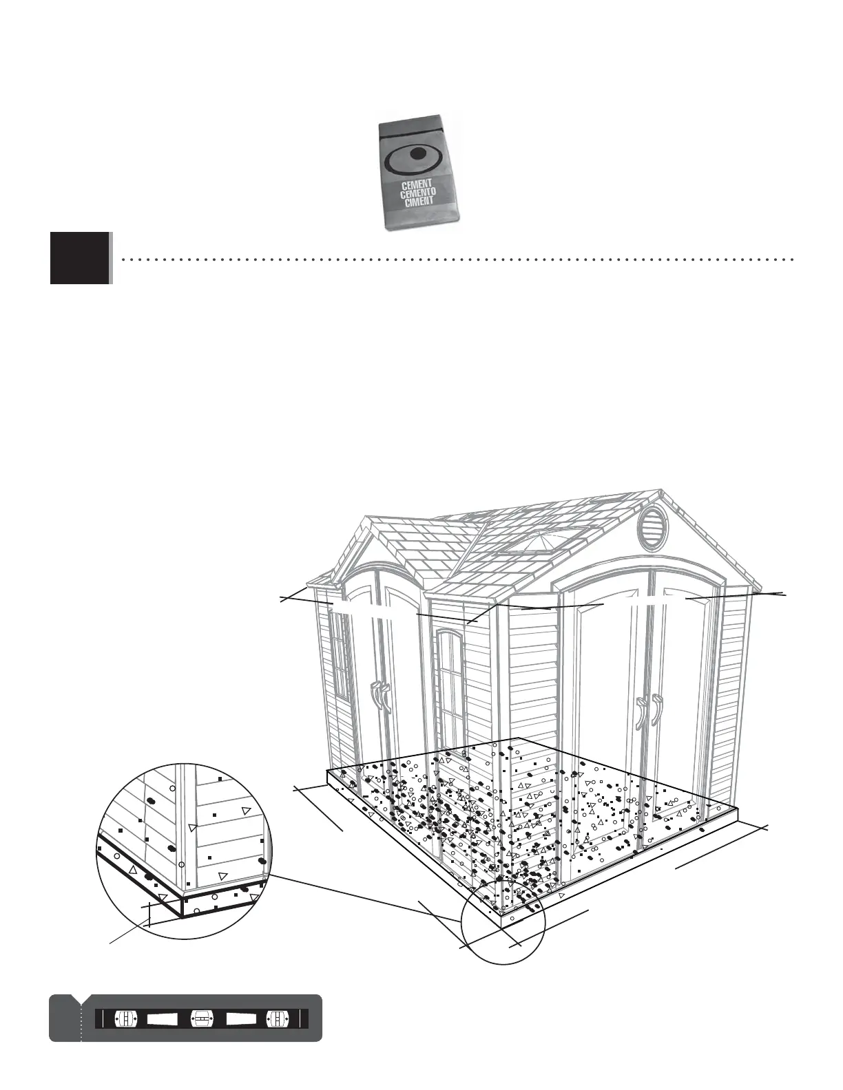 • The concrete should be approximately 4" (10,2 cm) thick. The actual dimensions of the shed, at its widest