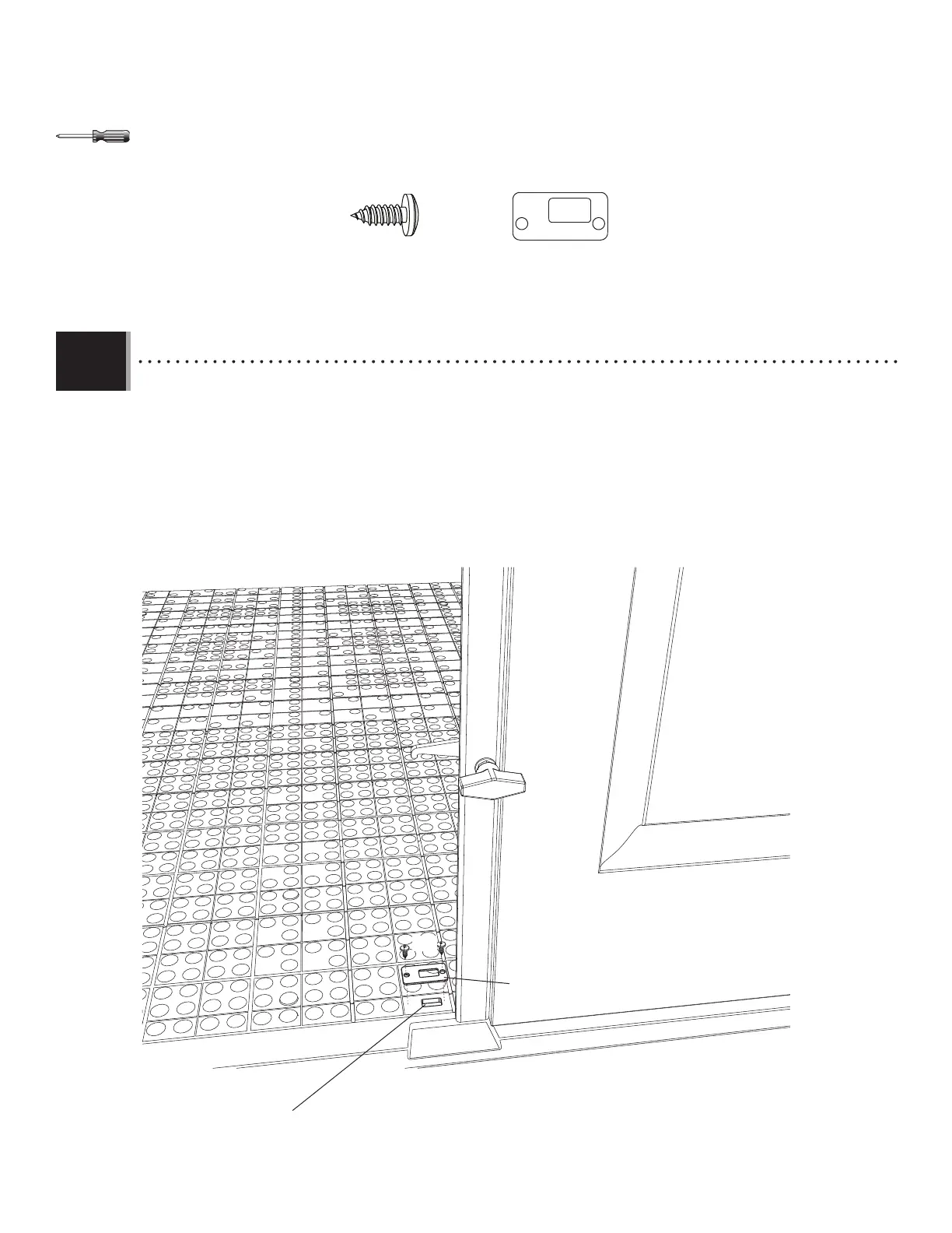 indiqué, y mettre la gâche sur le trou. Attacher la gâche au panneau de plancher à l’aide de deux (2) vis (ADX). Ne