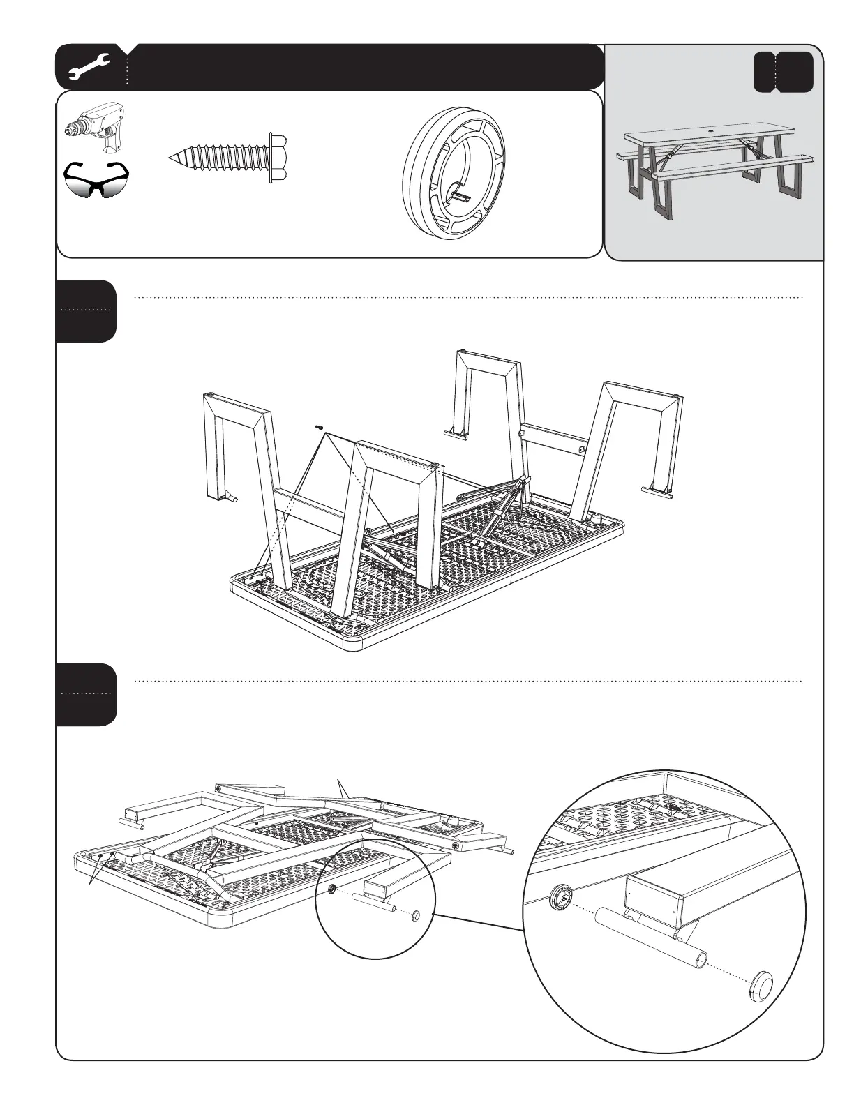 Set the Table Top Channel back in place. While another adult holds the Legs, reinsert the five (5) screws you