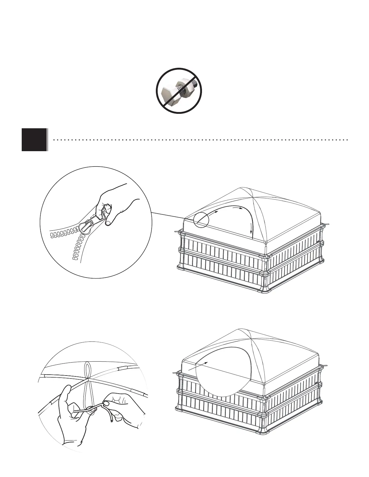 • Unzip the Frost Cover and tie the top of the Cover to the Rods as shown.