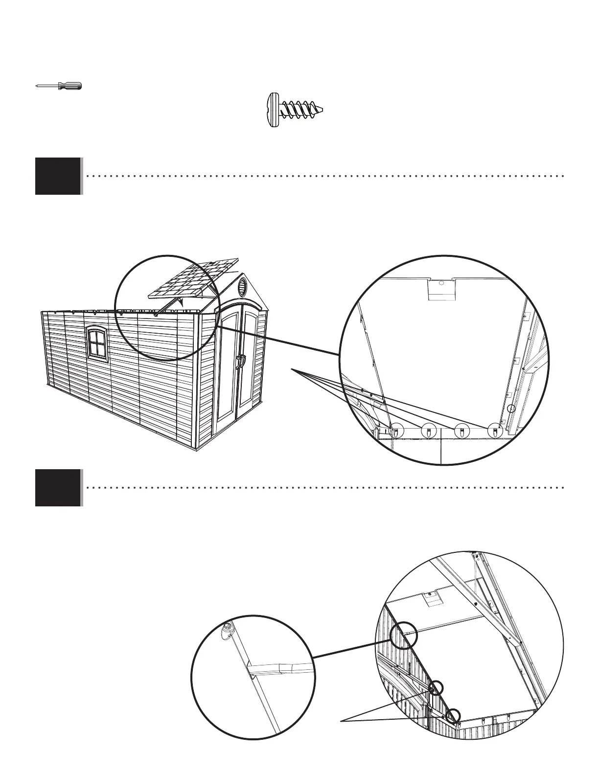 • Insert the fi rst two screws (ADZ) through the gable and into the roof panel at the locations shown. Insert the roof support