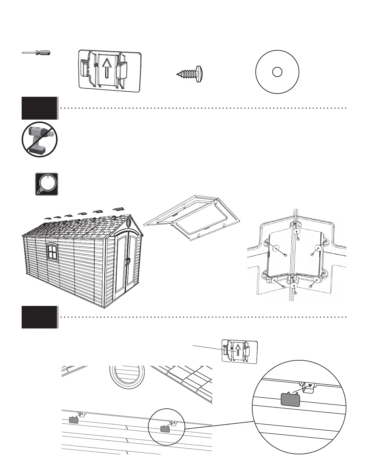 • Plier une lucarne (AHC), et l’attacher au toit à l’aide de six (6) vis (ADX) et rondelles (AED) pour chaque lucarne.
