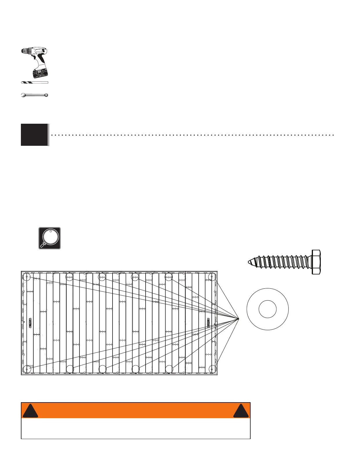 using a drill, 5/16" (≈8 mm) drill bit, twelve (12) 3/8" x 1 1/2" (≈10 mm x ≈4 cm) lag screws and twelve (12) 3/8"