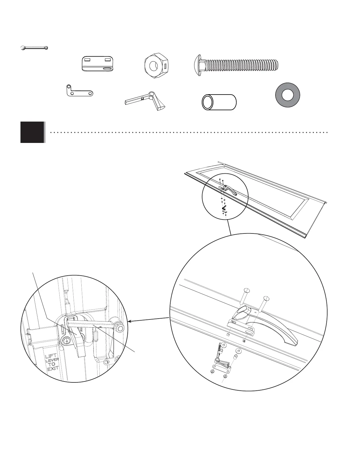 • Attach the Locking Hardware using the hardware included. The arm of the Latch rests on top of the Thumb Lever.