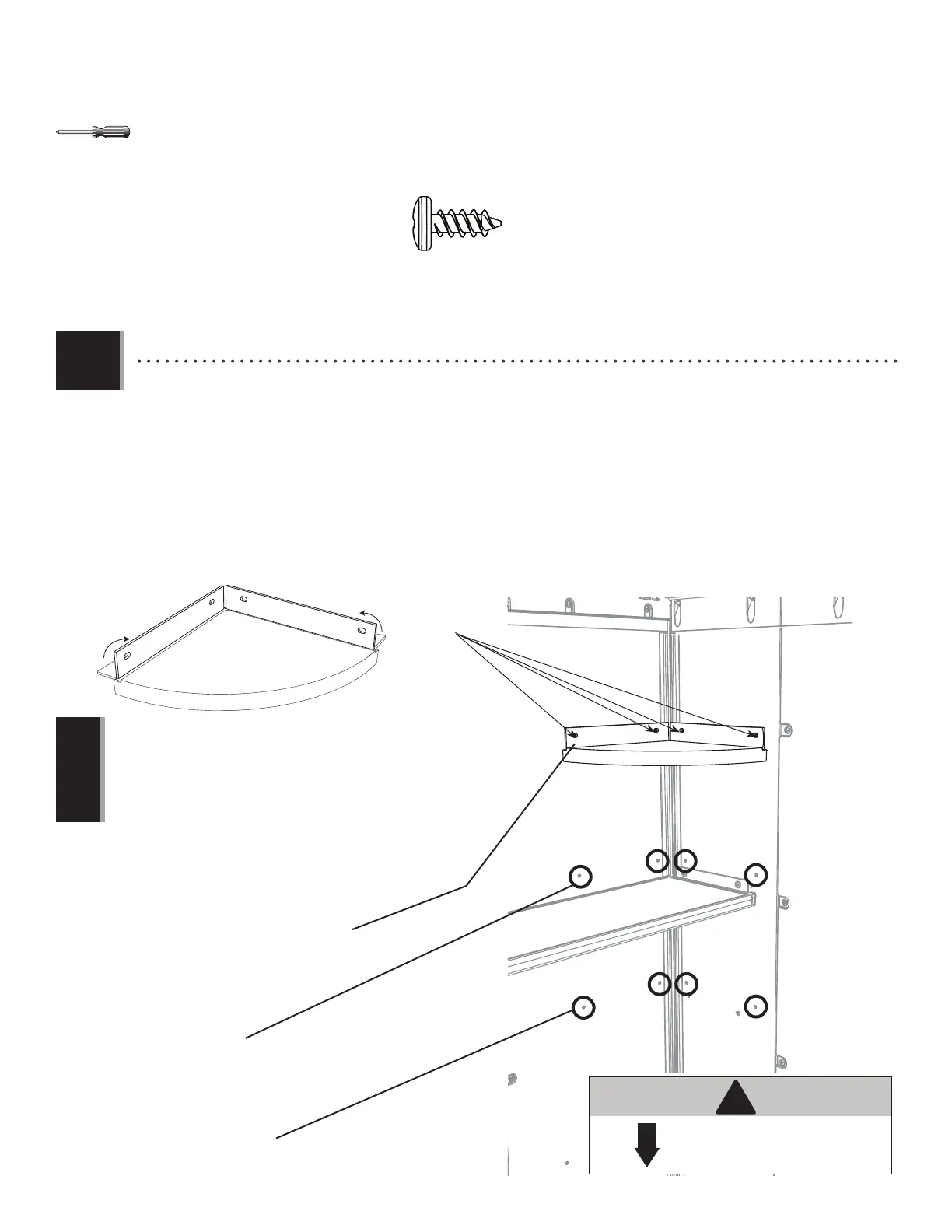 Shelf, and align the holes in the tabs with those in the Corner Wall Panel. Secure with four (4) Screws (ADZ).