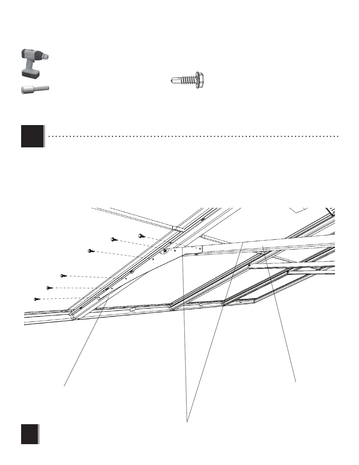paralelo con el soporte de cercha. Sujetar la placa al canalón y al soporte usando seis (6) tornillos autoroscantes (BRK)