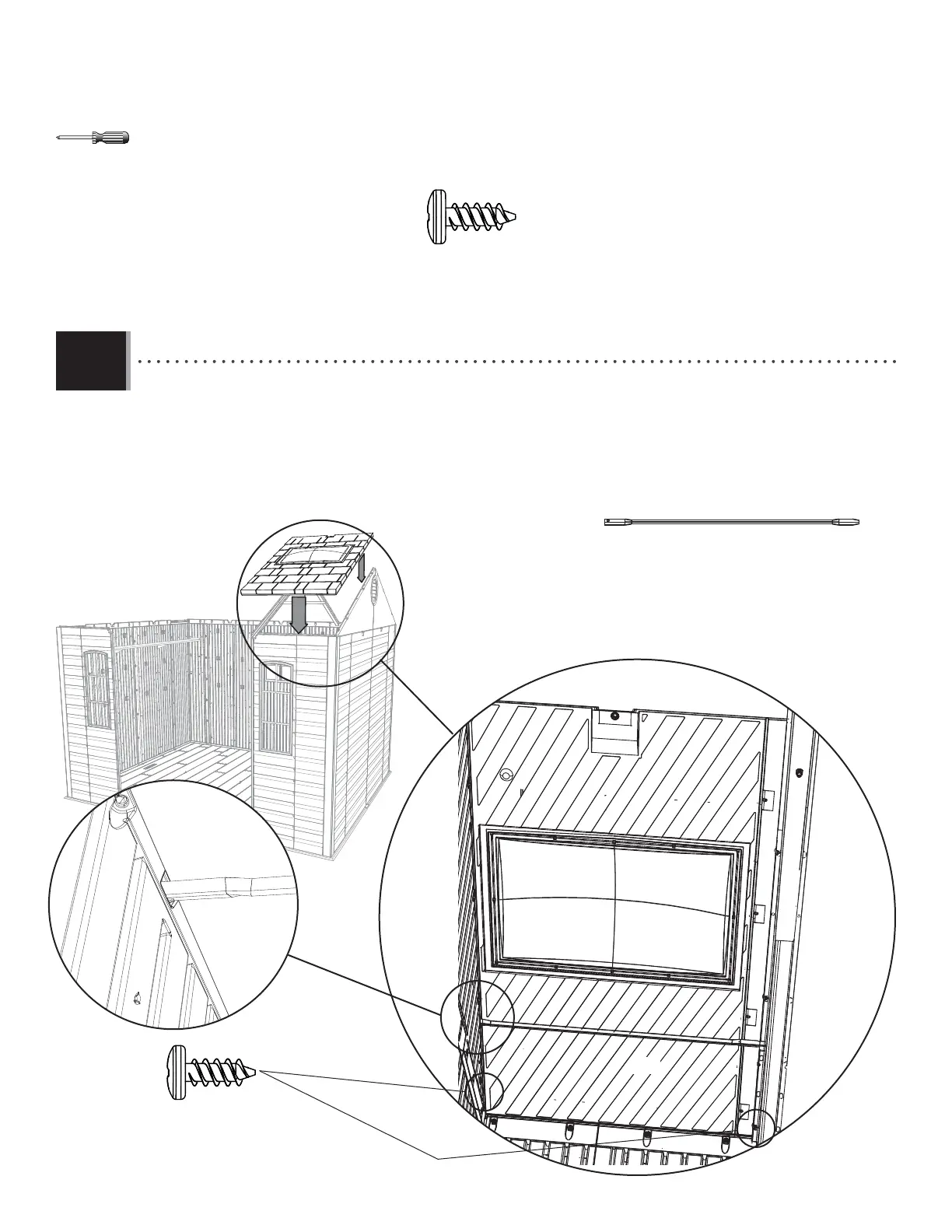 • Insert the fi rst two Screws (ADZ) through the Gable and into the Roof Panel with Skylight at the locations shown.