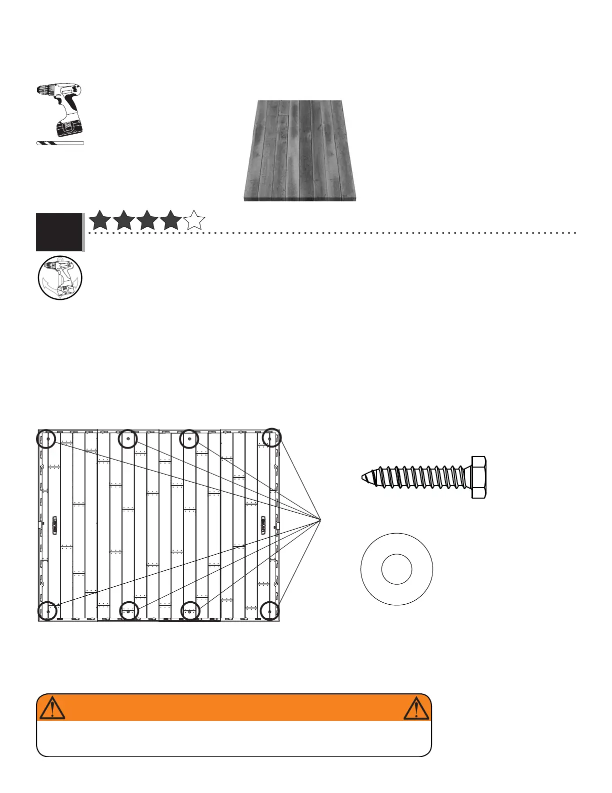 recommend using a drill, 5/16" (8 mm) drill bit, eight (8) 3/8" x 1 1/2" (10 mm x 4 cm) Lag Screws and eight (8)