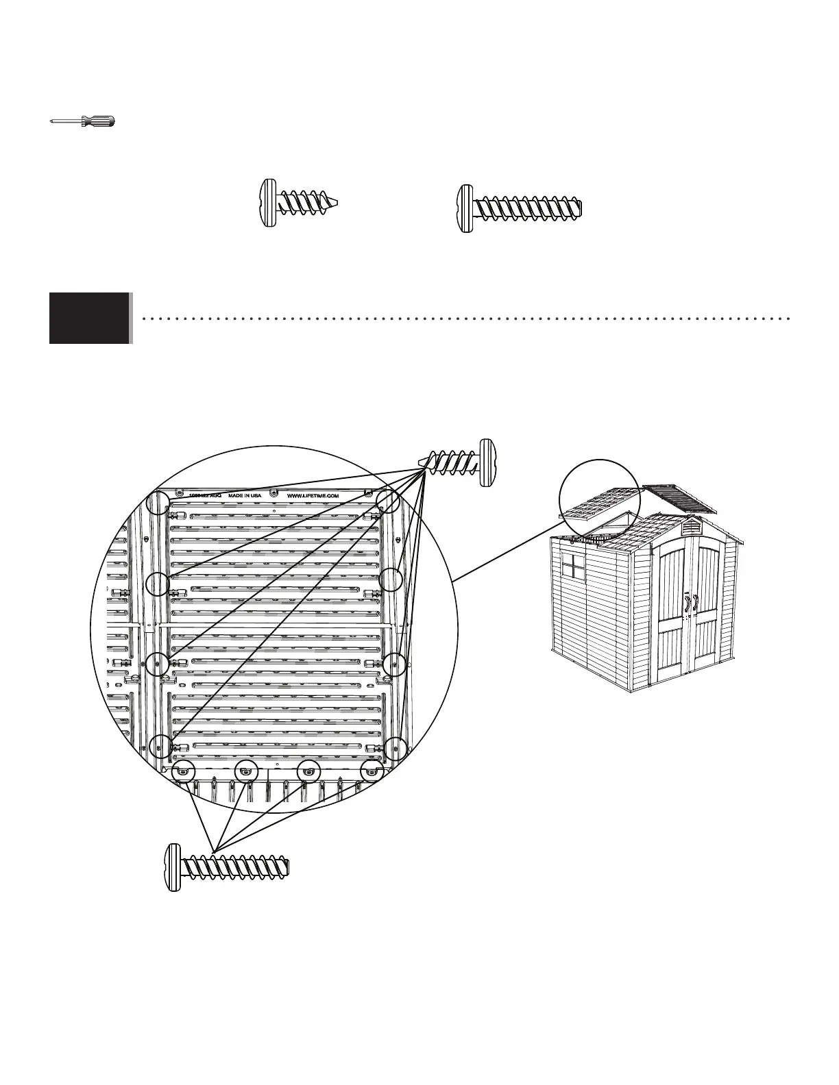 • Set a Roof Panel onto the Gable, Wall Panel, and Truss Assembly, and secure it with the hardware shown. Only