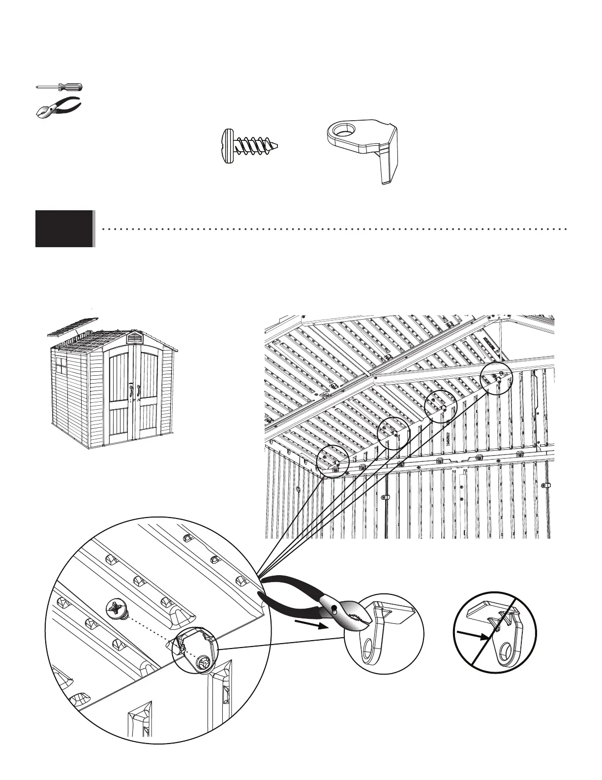 • Set the Roof Panel onto the Gable, Wall Panel, and Truss Assembly. Orient the Clips (BYT) as shown in this