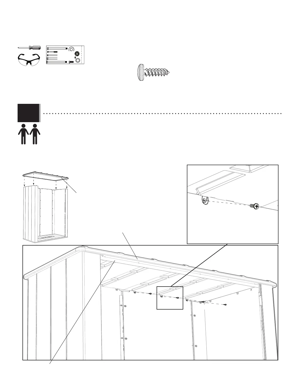 Support is over the opening. While one adult holds the Roof in place, secure the Roof to the right Rear Wall Panel using four (4)