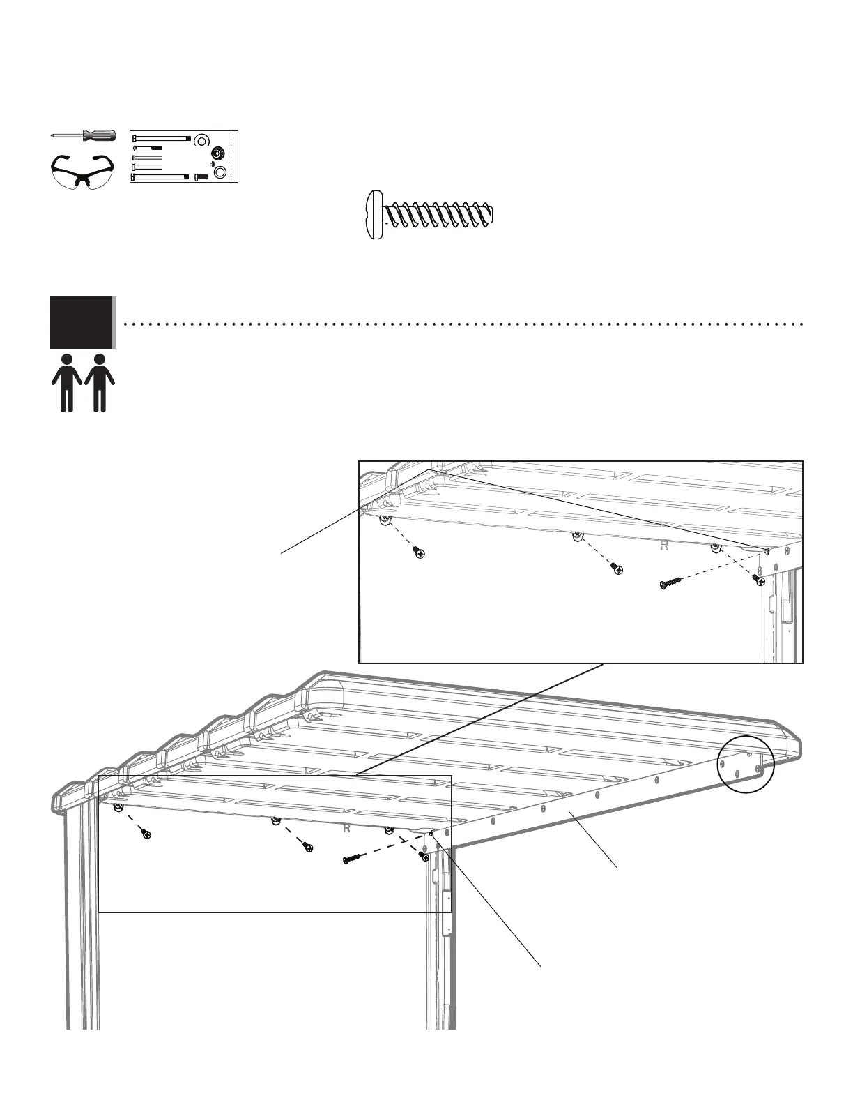 • While another adult pulls down on the Roof to hold it in place, secure the Roof Panel to the right Side Wall Panel