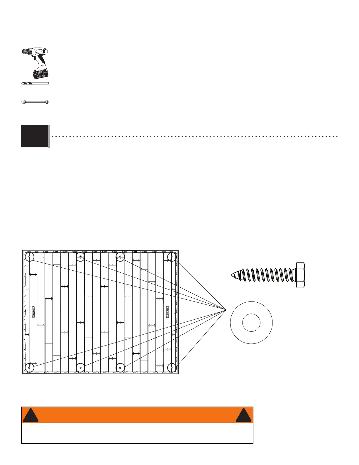 recommend using a drill, 5/16" (8 mm) drill bit, eight (8) 3/8" x 1 1/2" (10 mm x 4 cm) Lag Screws and eight (8)