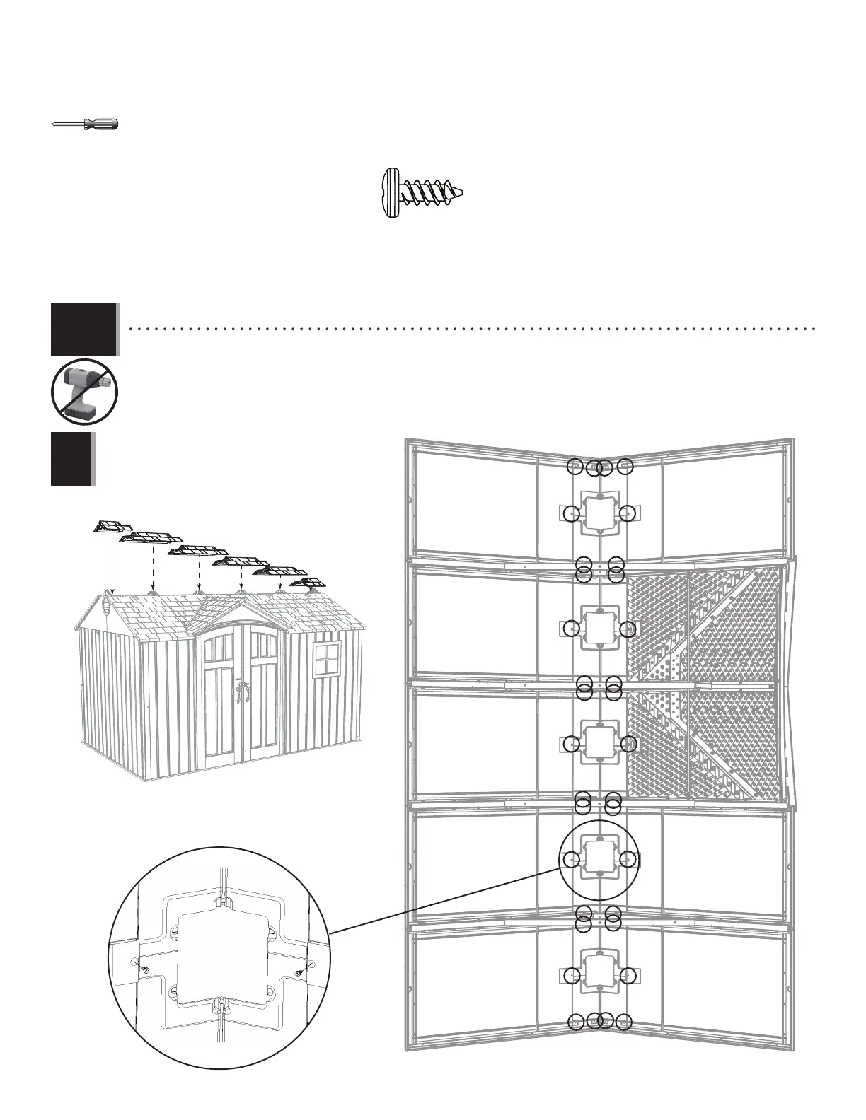 • Empezando a la parte delantera, sujetar las cumbreras a la caseta usando el herraje incluido.