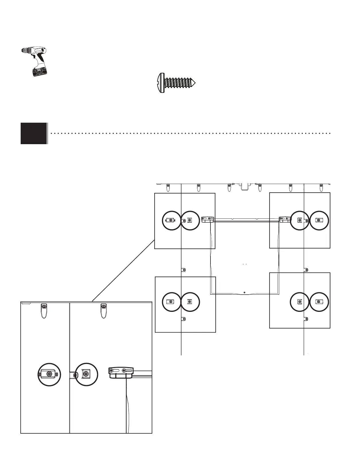 • Il y a quatre groupes de deux indicateurs pour l’emplacement des vis. Une par une, insérer les vis (ARV) à travers les