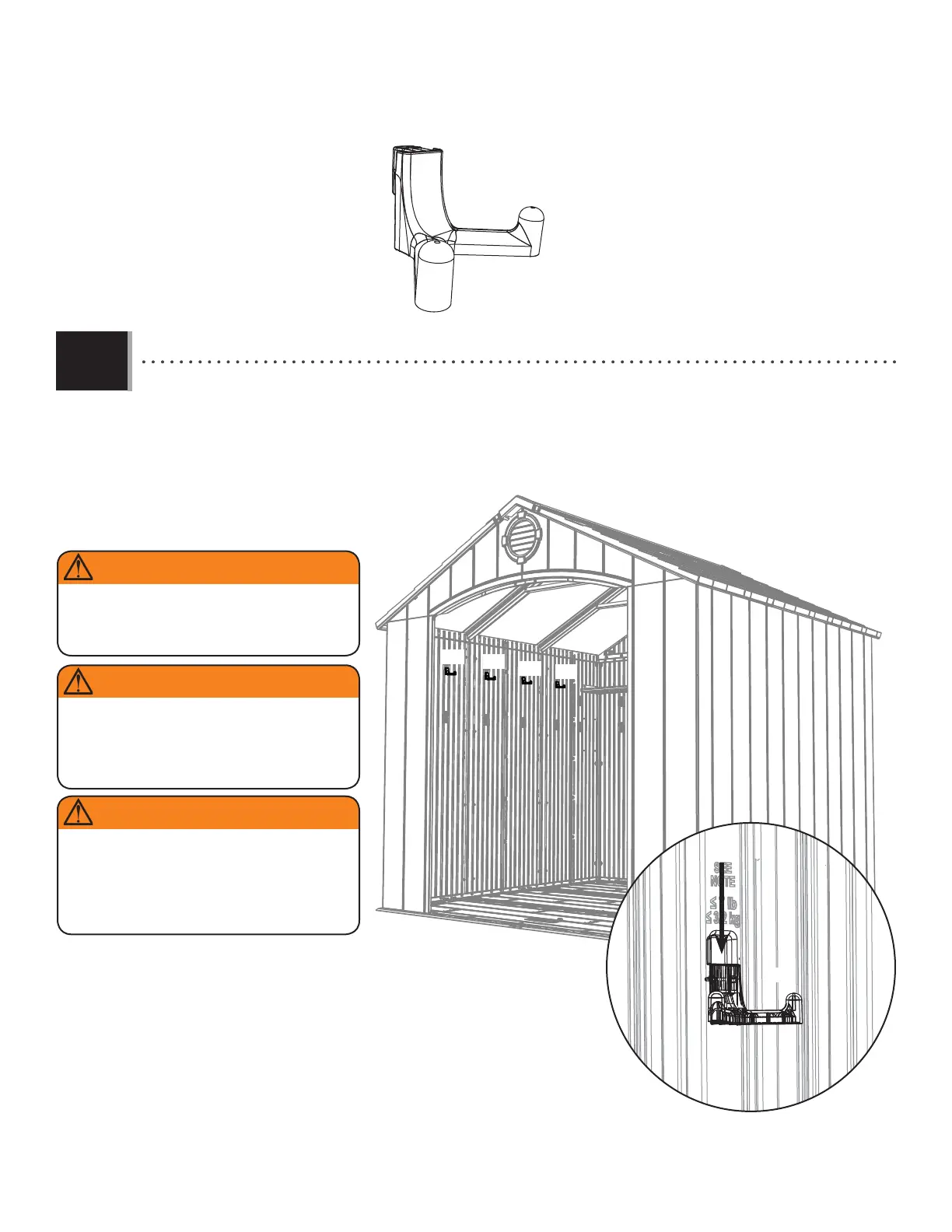 • Insert the six (6) Wall Hooks (EDL) into any of the notches in the Wall Panels (either side of the shed). Then push