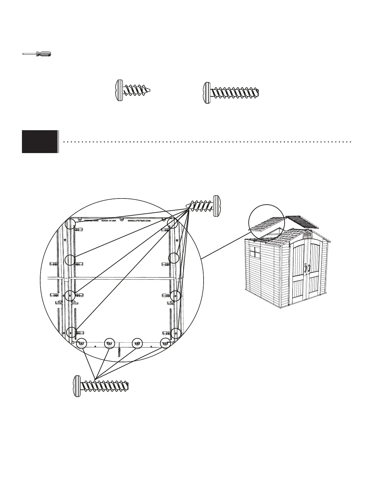 • Set a Roof Panel onto the Gable, Wall Panel, and Truss Assembly, and secure it with the hardware shown. Only