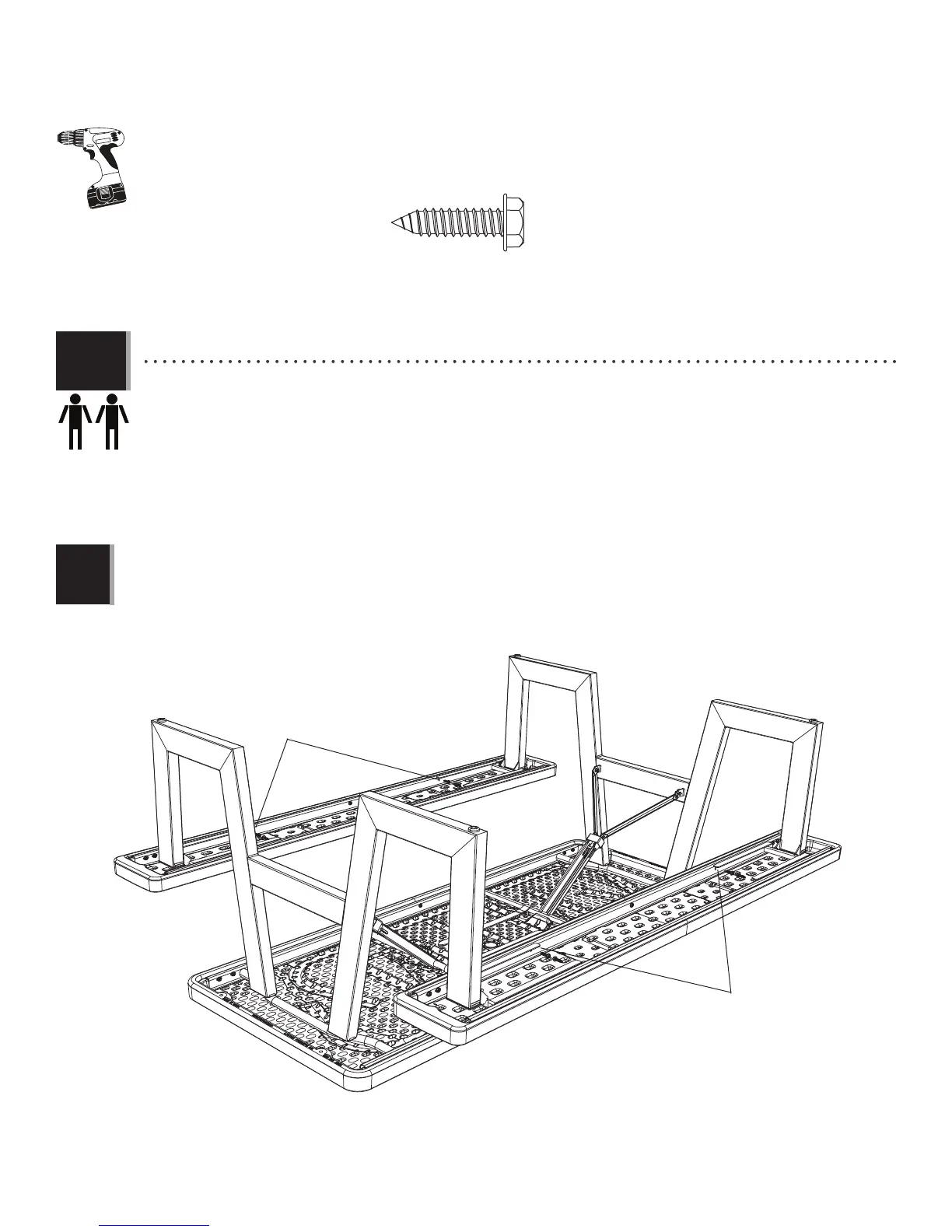 • While another adult holds the Table Legs upright, insert four (4) Screws (BWH) through the holes in the Bench