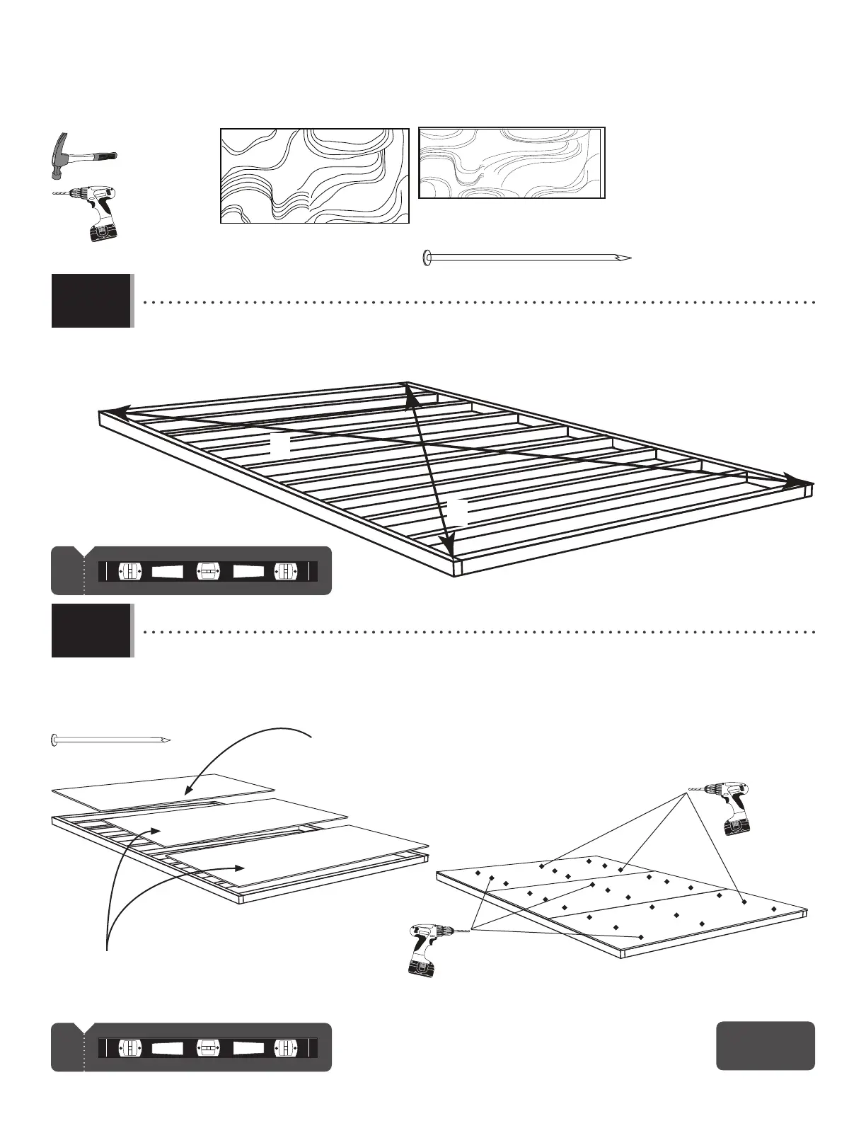 • Using nails, fasten the plywood to the frame. Then, drill 5/16" (≈8 mm) holes between the studs for drainage.