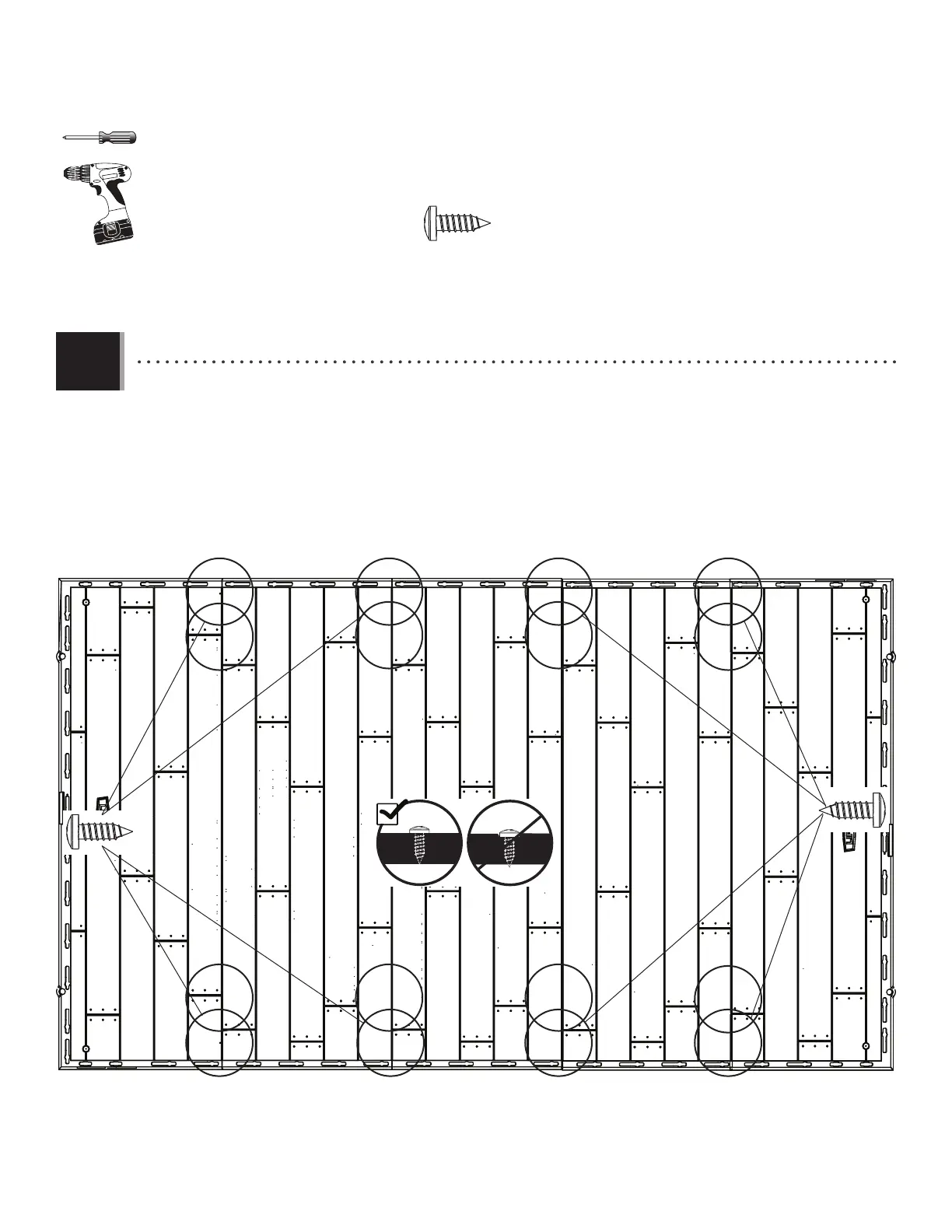 • Insert the screws (BQC) through the divots in the fl oor panels and into the tabs of the adjacent fl oor panels. (The