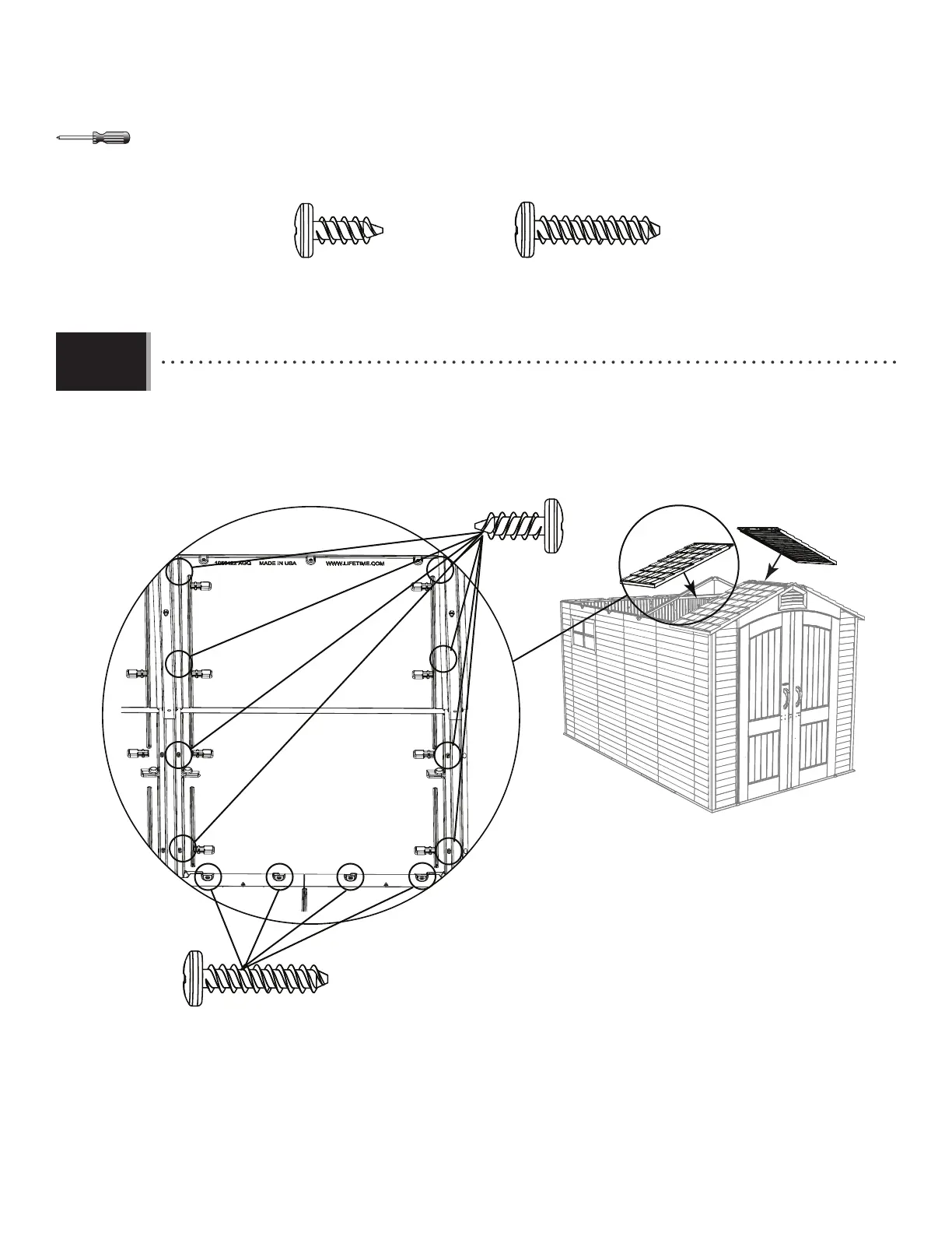 • Set a roof panel onto the gable, wall panel, and truss assembly, and secure it with the hardware shown. Only