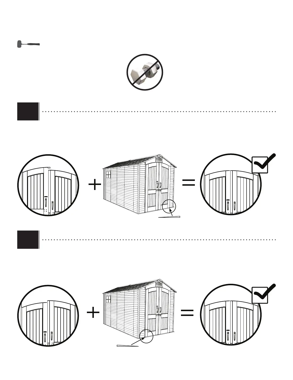 • Si la puerta derecha es más alta, insertar una cuña debajo el piso y la bisagra izquierda hasta que las dos