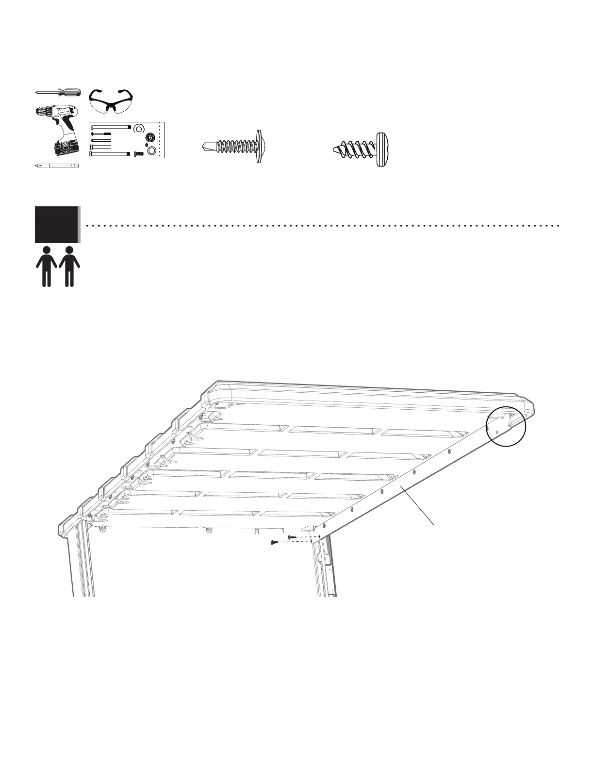 • Mientras que otro adulto mantiene bien el tejado en su lugar, fi jar el panel de techo a los paneles murales usando