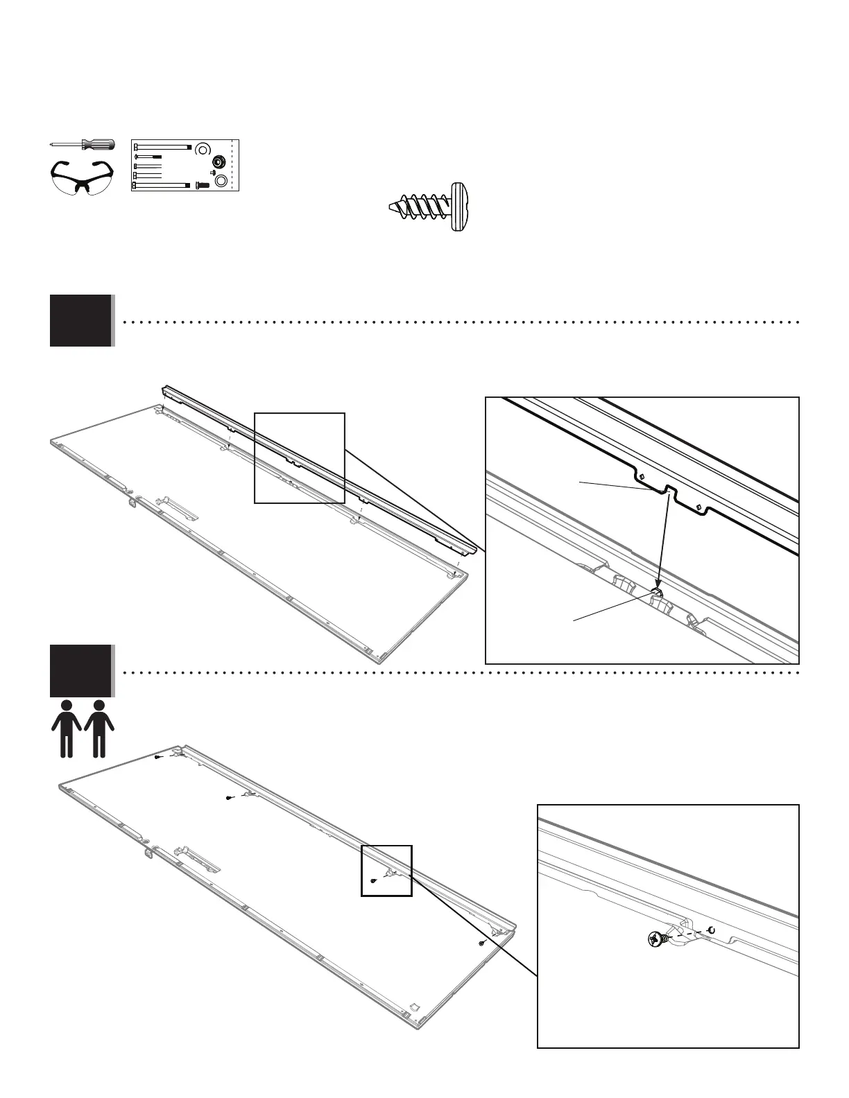 • While one adult holds the Channel tight against the Door, insert four (4) Screws (ADZ) to secure the Channel in place.