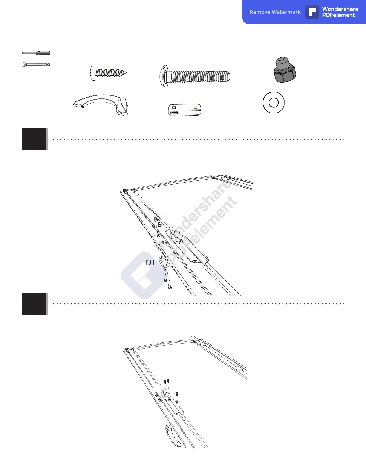 • Attach the door latch (FUH) to the door using the hardware included. Do not overtighten.