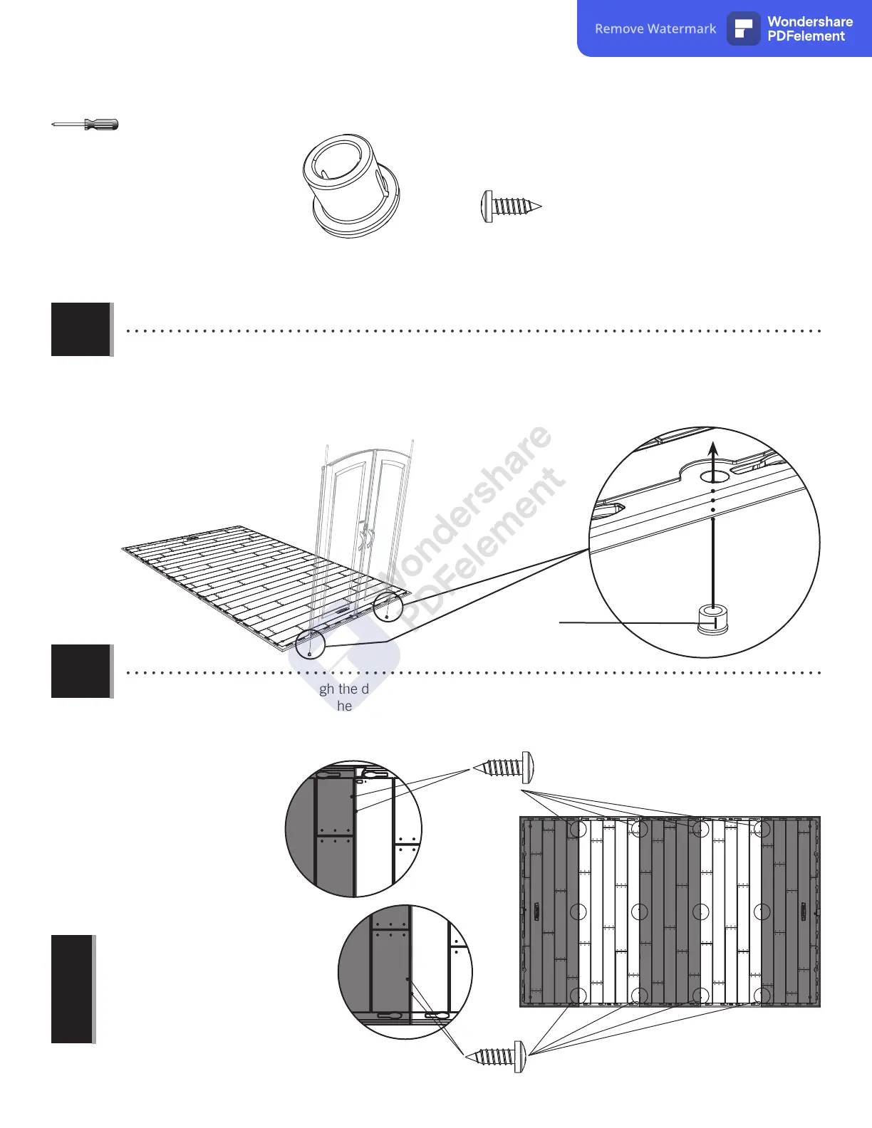 • Insert Bushings (AHO) through the holes in the Floor. The slit in the Bushing should face the front of the shed.